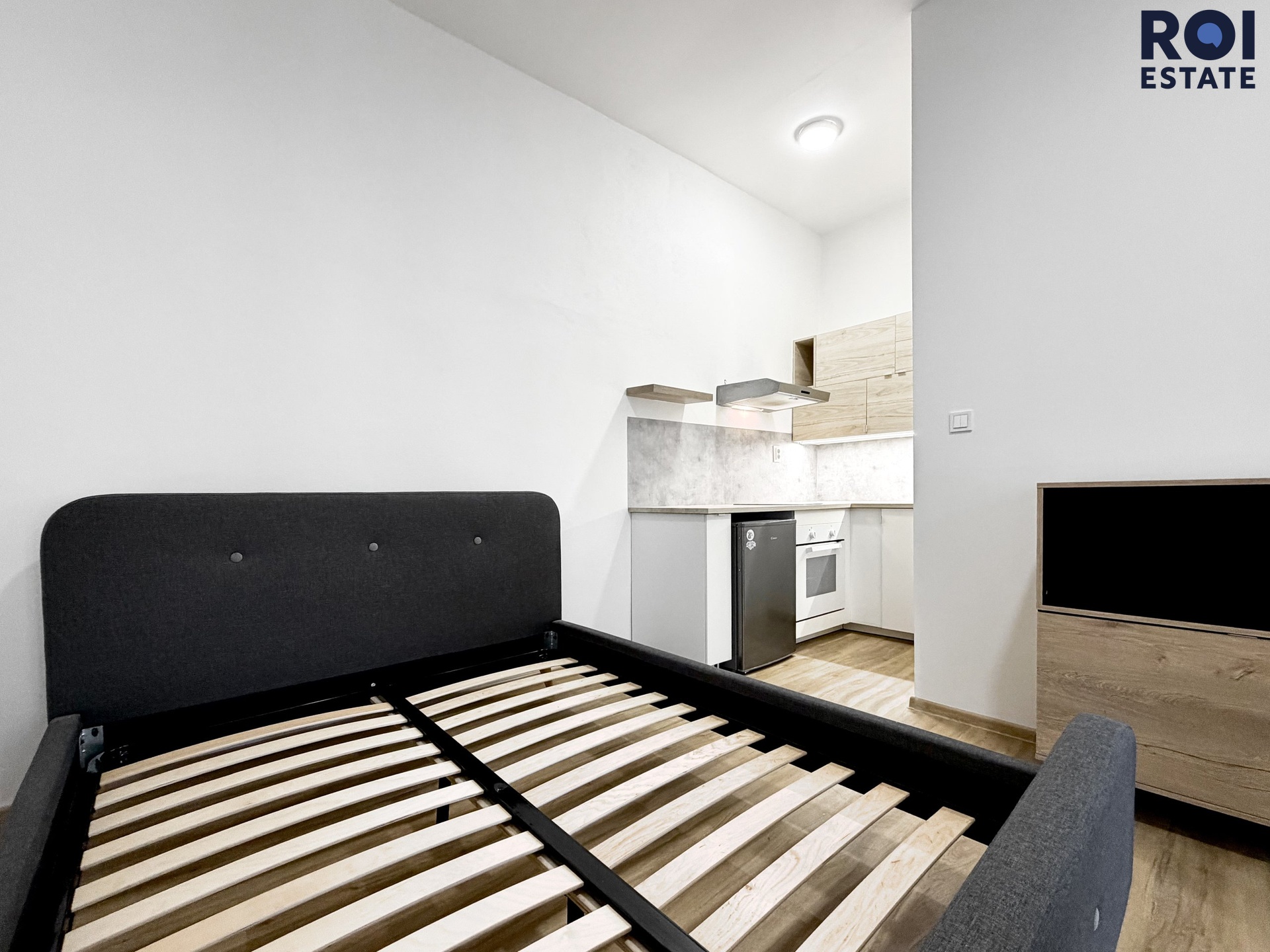 Byt je zařízený a připravený k nastěhování. V obytné části najdete postel, komodu, skříň a police pro dostatek úložného prostoru. Kuchyňský kout je vybaven lednicí, troubou, varnou deskou a digestoří.