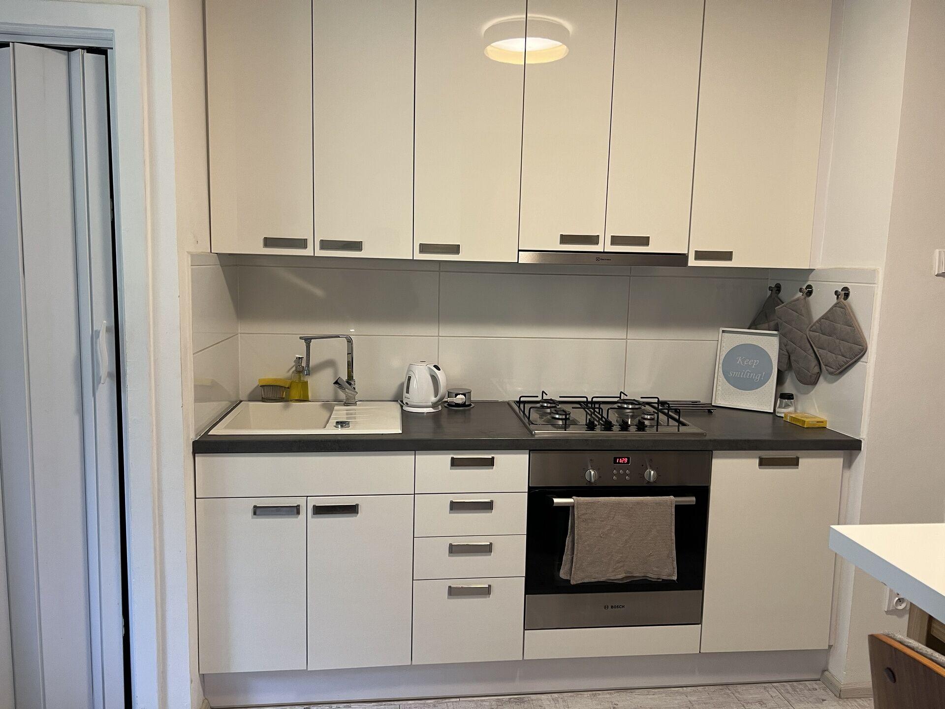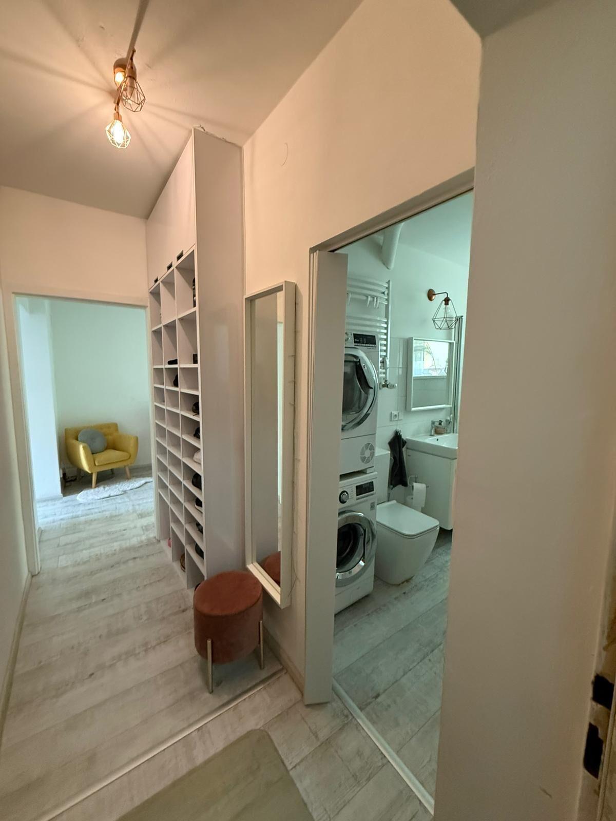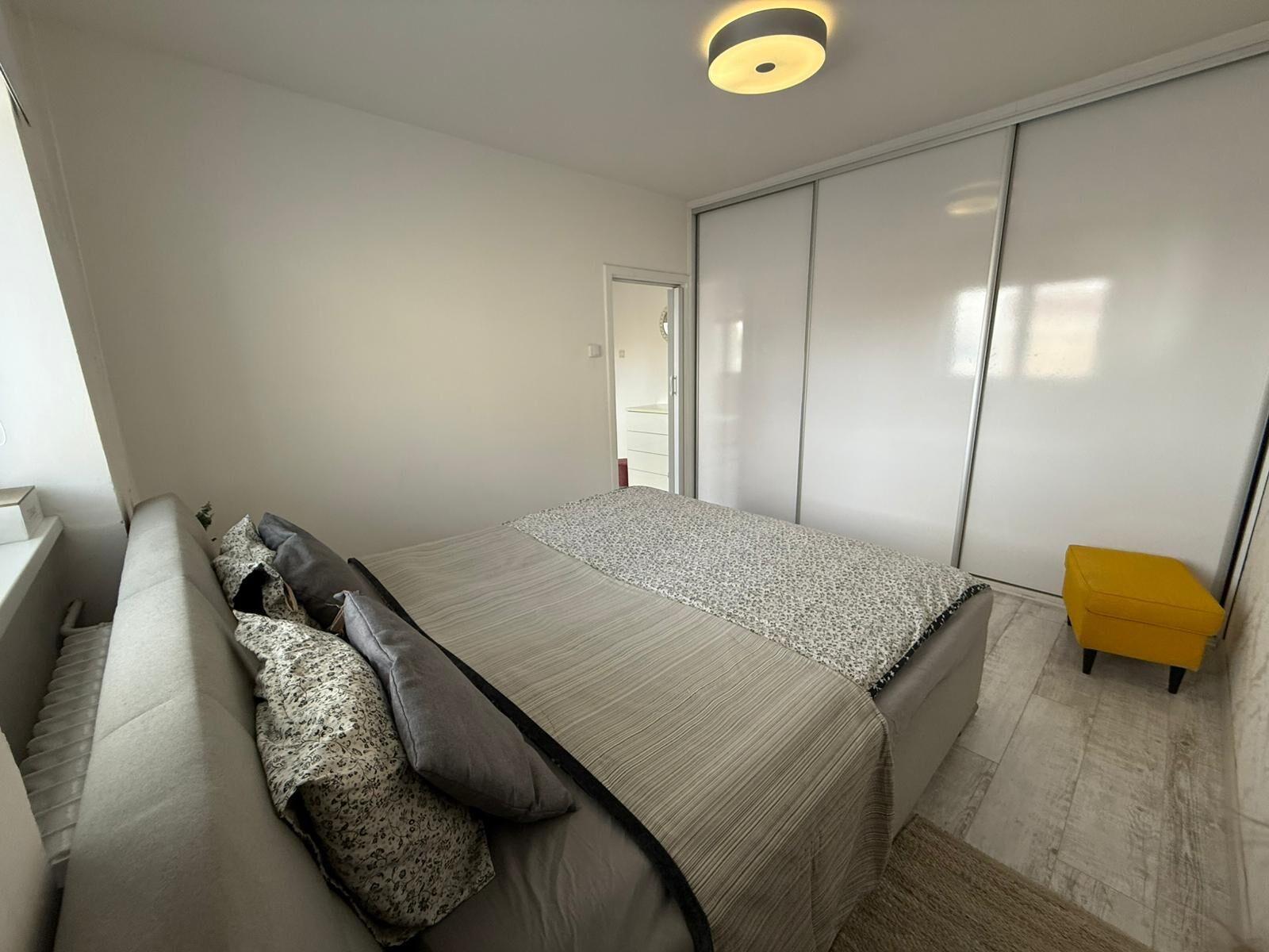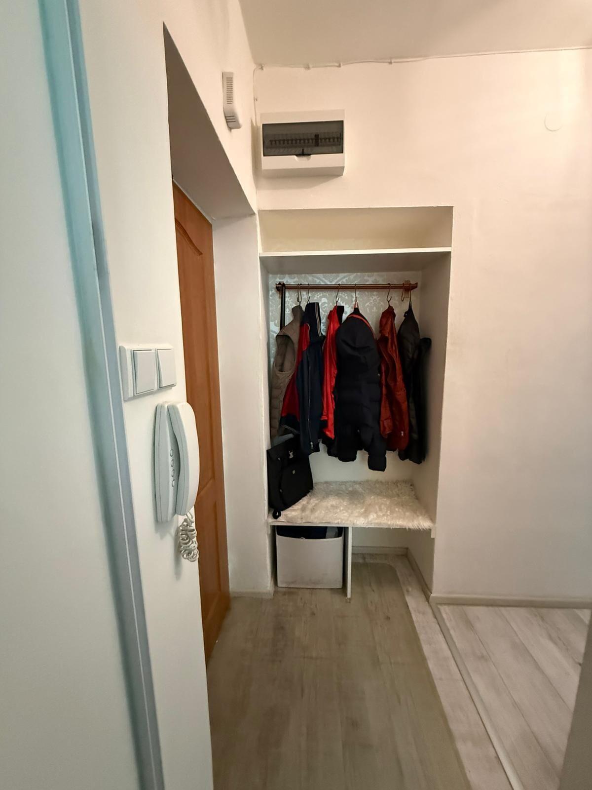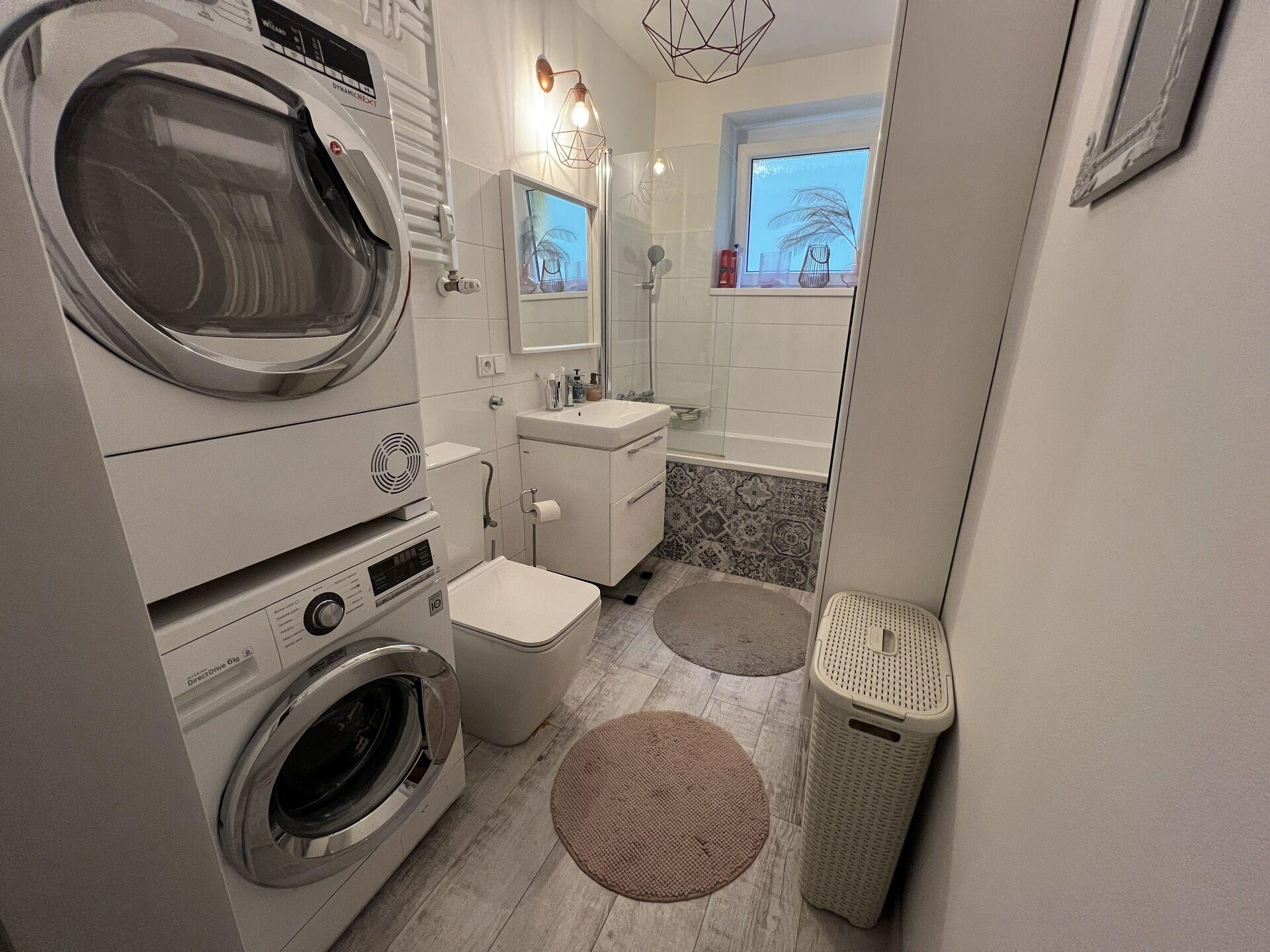 Byt je plně vybaven a připraven k nastěhování. K dispozici je kuchyňská linka se spotřebiči a kompletním kuchyňským vybavením, lednice s mrazákem, myčka, sedací souprava, konferenční stolek, jídelní stůl se čtyřmi židlemi, mikrovlnná trouba, komoda, policový regál, skříň, vestavěné skříně, noční stolky, vysavač, malá skříňka, pohodlná dvojpostel, pračka a sušička, televize, předsíňová policová stěna a věšák. Interiér je světlý, prakticky řešený a působí velmi příjemným dojmem.