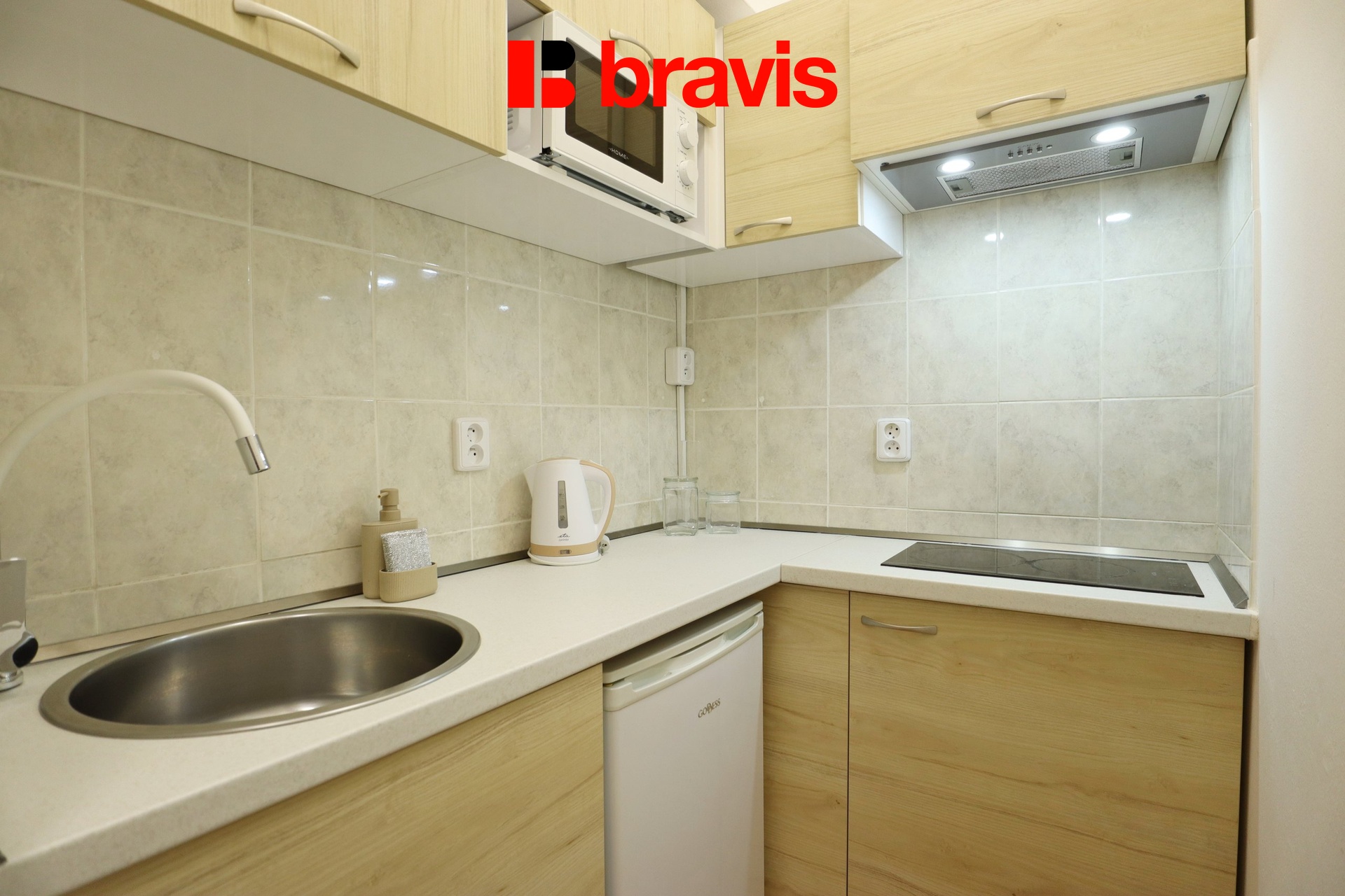 Kuchyňská linka je vybavena lednicí s mrazicím boxem, varnou deskou, digestoří, mikrovlnnou troubou, rychlovarnou konvicí i základním kuchyňským nádobím.