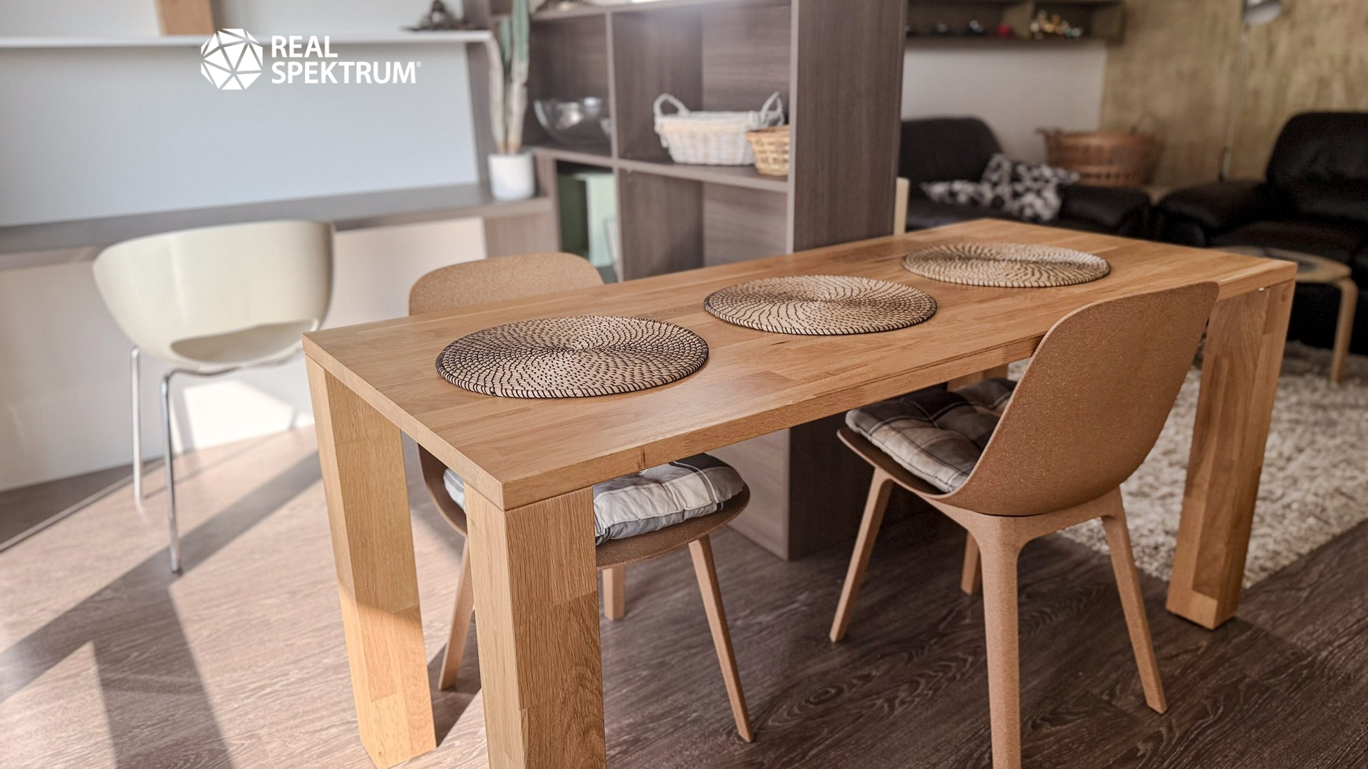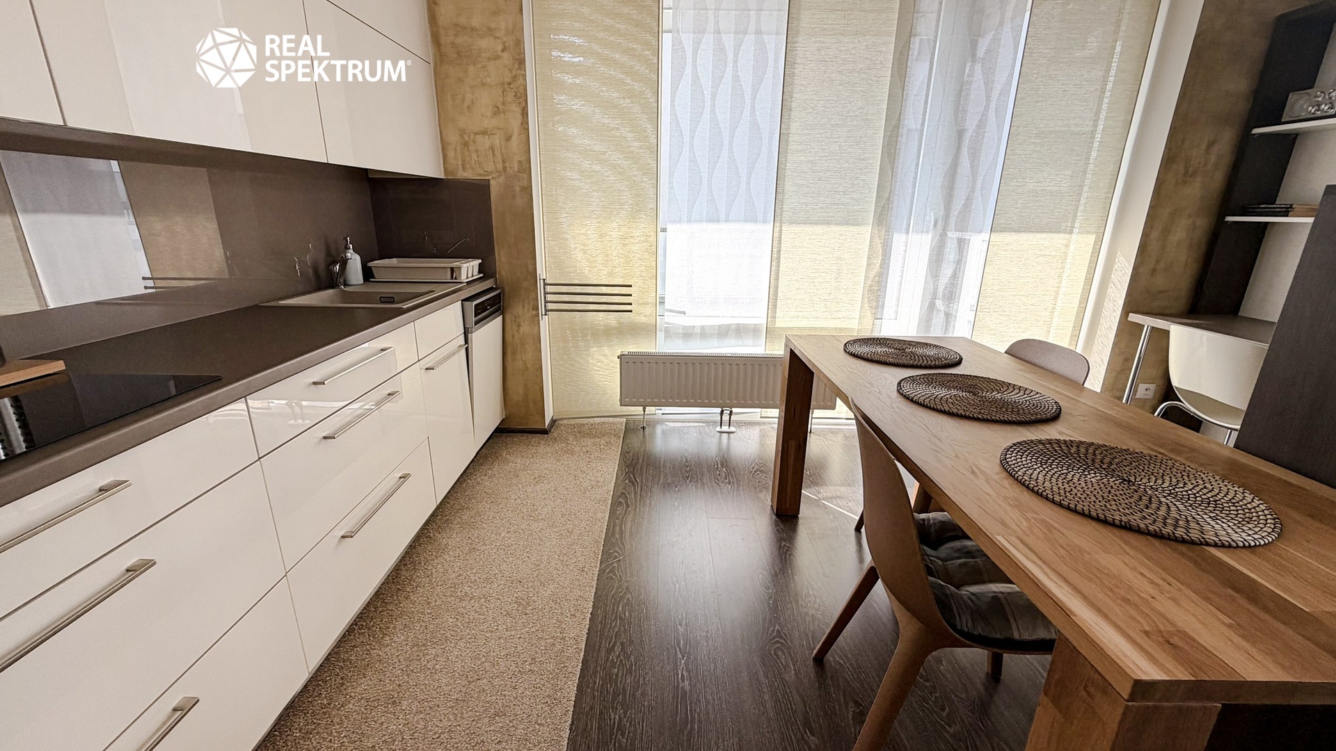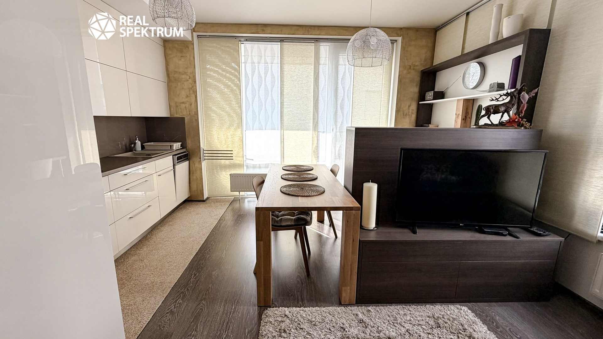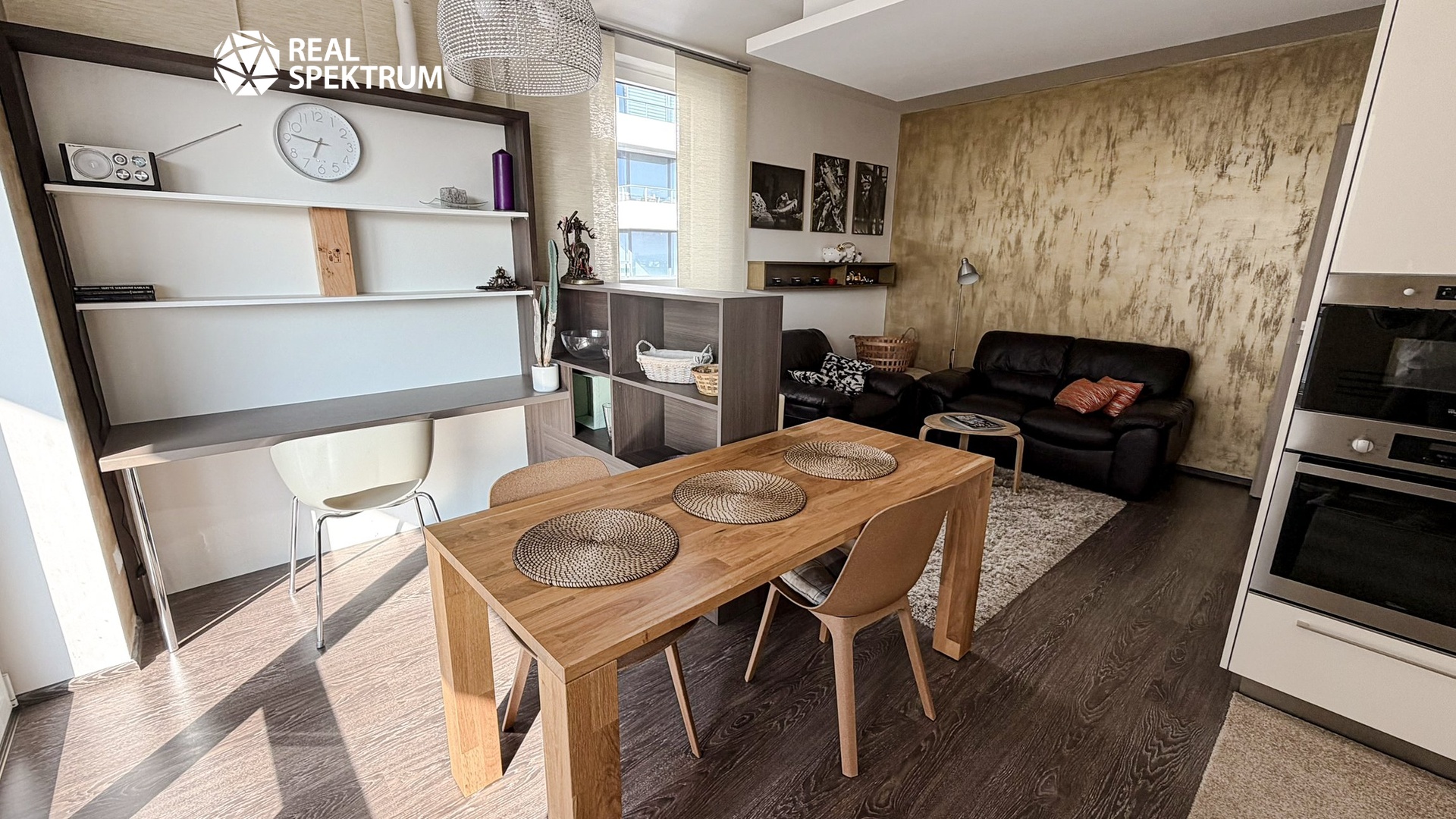 Obývací část s kuchyňským koutem tvoří přirozené centrum bytu. Moderní kuchyňská linka s vestavěnými spotřebiči navazuje na jídelní prostor i útulnou obývací zónu. Interiér je zařízen vkusně a nadčasově, s důrazem na jednoduchost a pohodlí. Praktickým bonusem je také pracovní kout vhodný pro práci z domova.