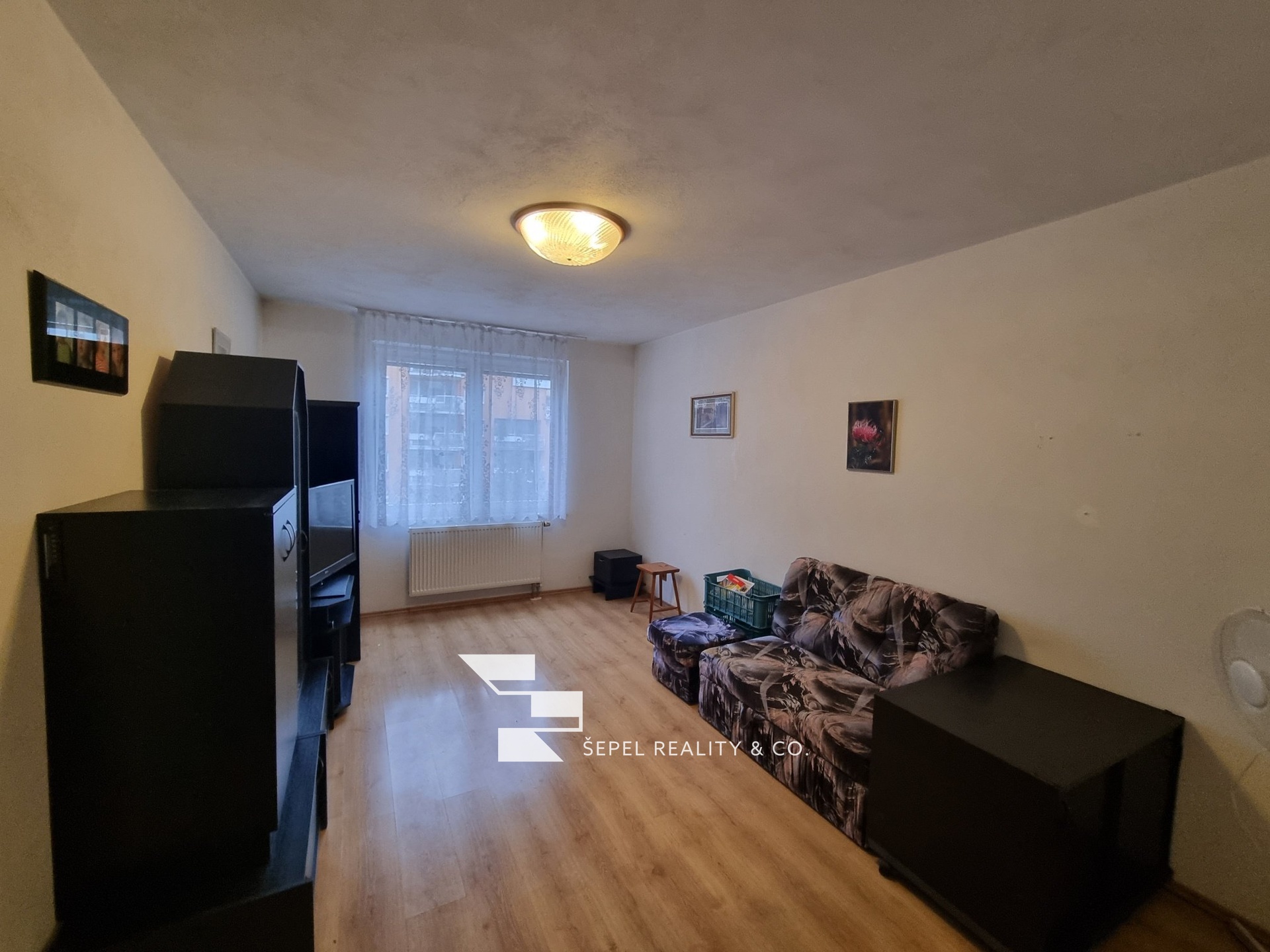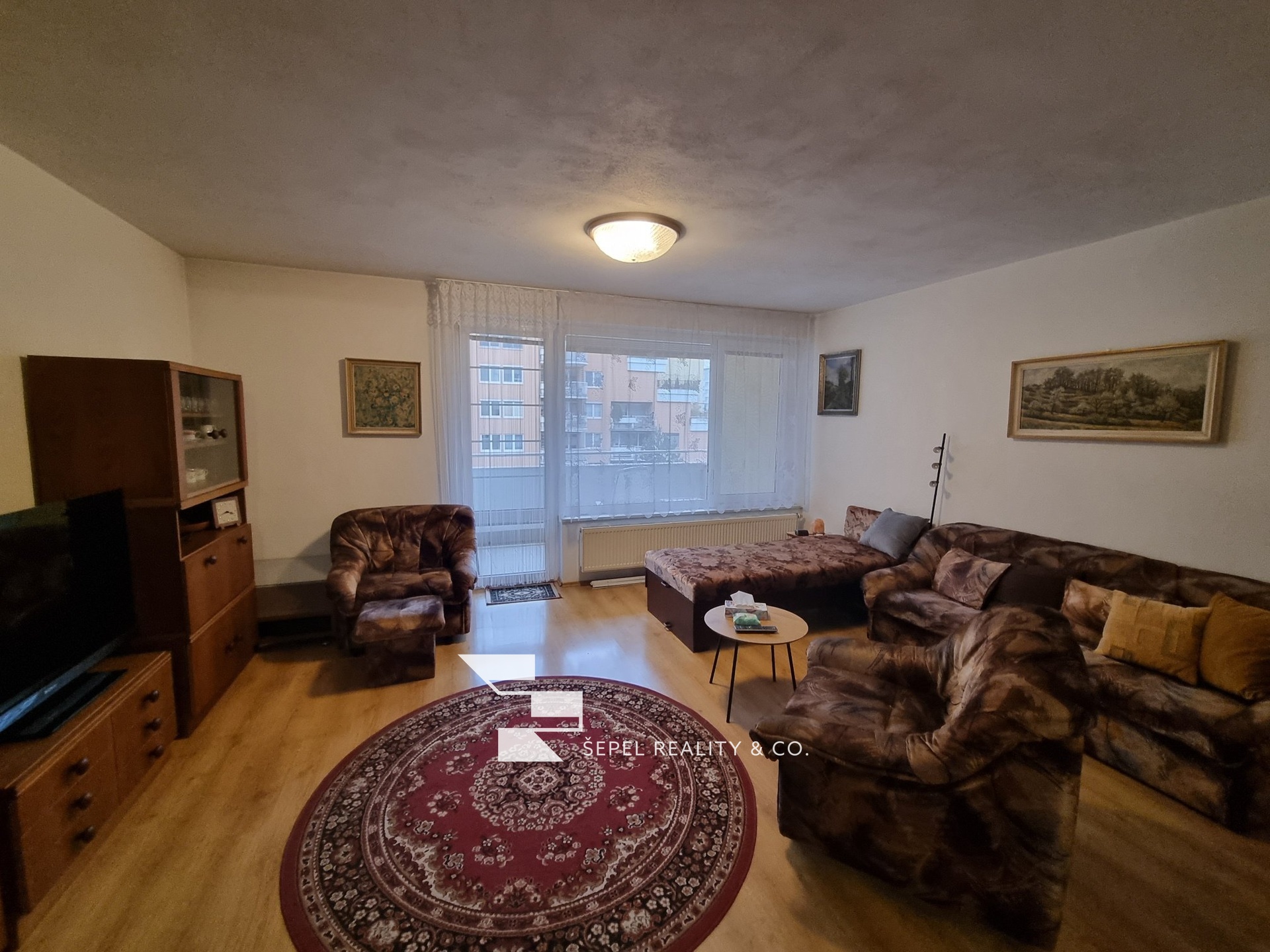 V obývací části je obývací stěna s TV, sedačka, křeslo a válenda, dále konferenční stolek a vstup na balkon.