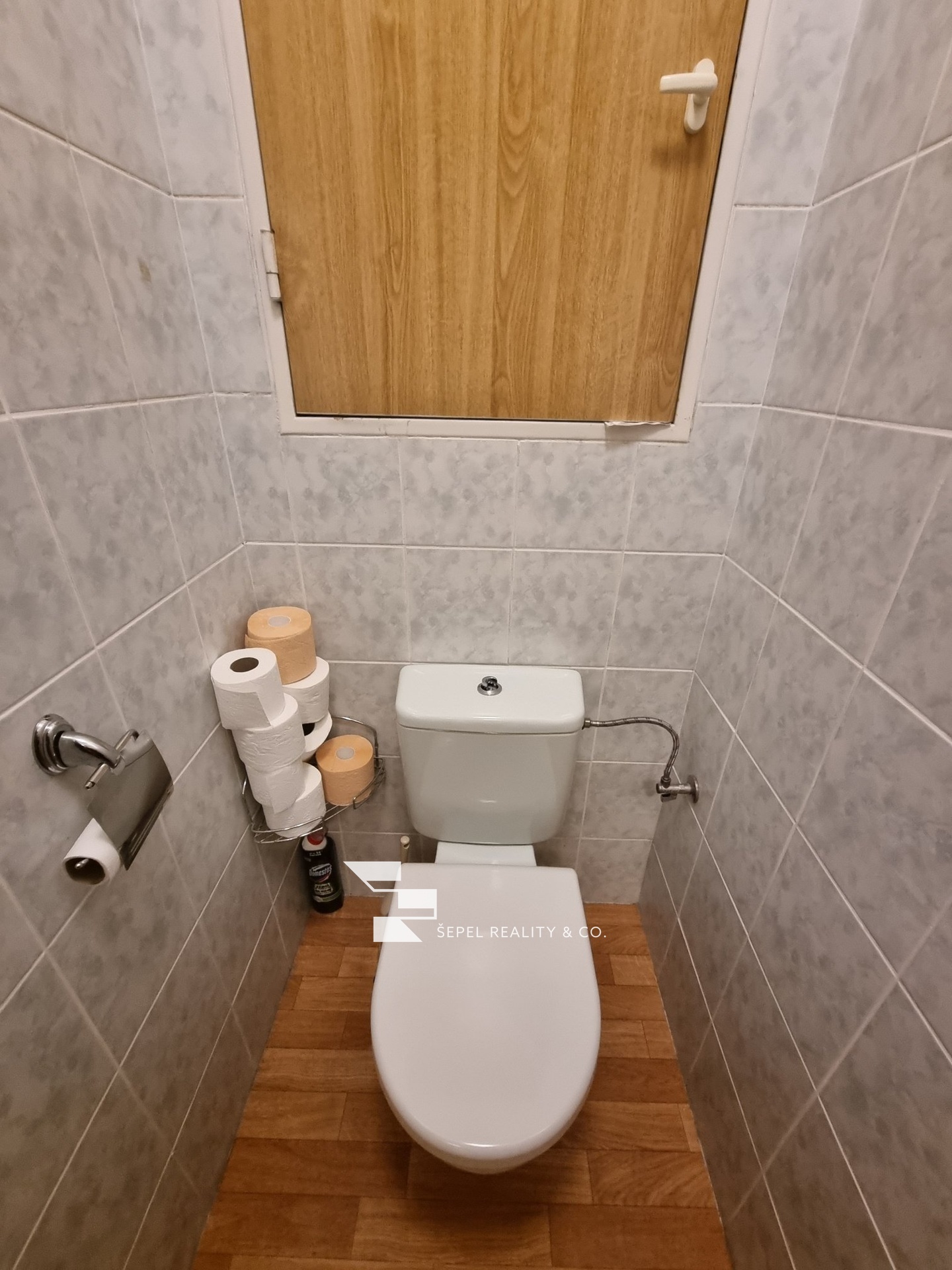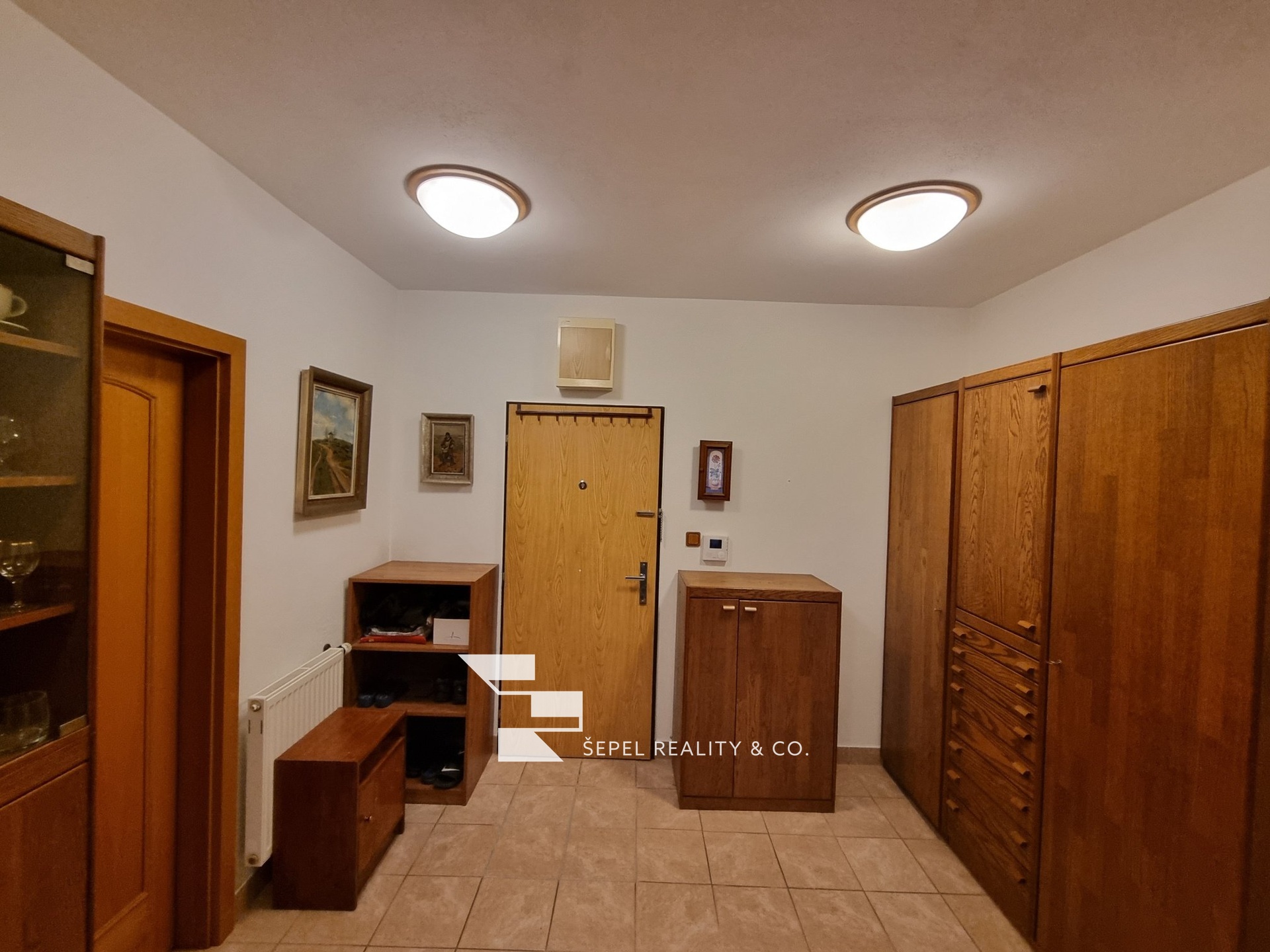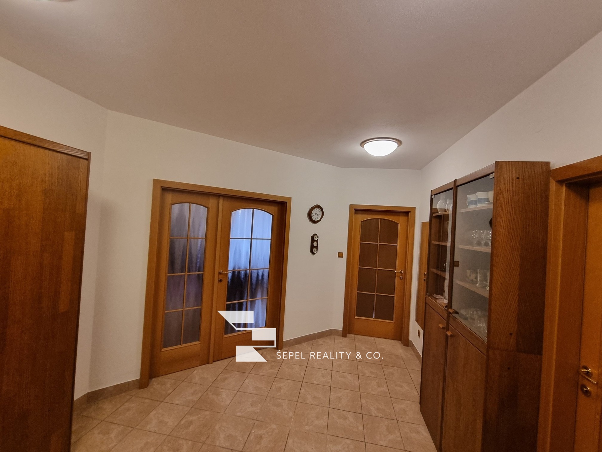 V prostorné předsíni jsou skříně, botník, a vstup na samostatné WC a koupelny s vanou a pračkou.