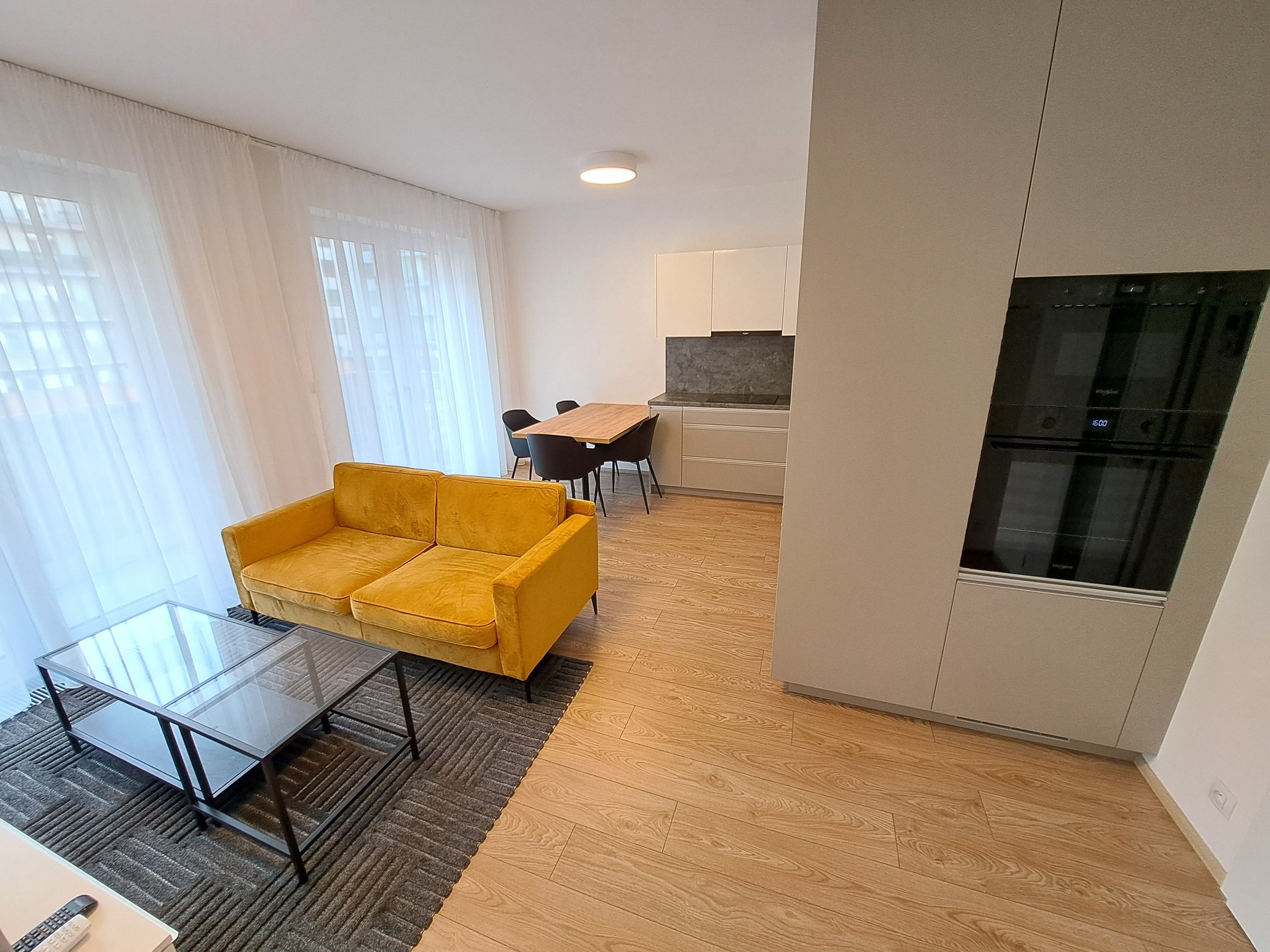 Nová kuchyňská linka se spotřebiči (lednička s mrazákem AEG, varná deska Whirlpool, digestoř Whirlpool, elektrická trouba Whirlpool, MV trouba, myčka 45 cm Whirlpool, dřez, baterie), pokoj s kk (jídelní stůl + 4x židle, TV stěna, sedací pohovka, 2x TV stolek, koberec, klimatizace Sinclair, 2x garnyž), pokoj (postel, vestavěné skříně, 2x noční stolek, garnyž, záclony), koupelna s WC (velká sprcha, umyvadlo se skříňkou, zrcadlo, závěsné WC, topný žebřík, větrák), chodba (vestavěné skříně, 2x komoda, pračka Candy, zrcadlo, věšáková stěna), světla, venkovní žaluzie, 3x sítě.