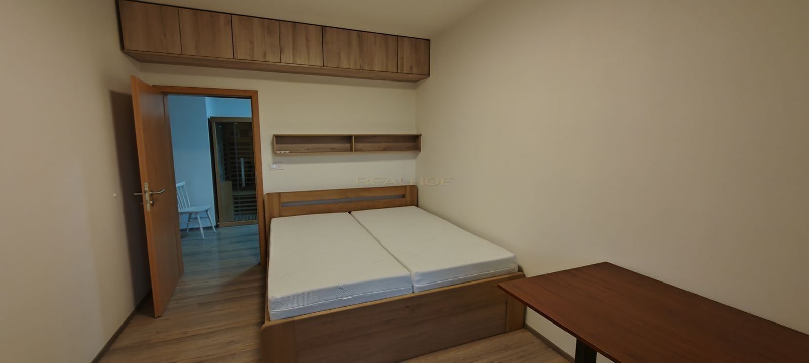 Dispozice: vstupní hala s vestavěnými skříněmi, saunou, obývací pokoj s kuchyňskou linkou na míru včetně spotřebičů elektrická trouba, mikrovlnná trouba, varná deska, lednička s mrazákem, myčka nádobí, kávovar, ložnice s kvalitní manželskou postelí, pracovní elektrický stůl, koupelna se sprchovým koutem a WC.