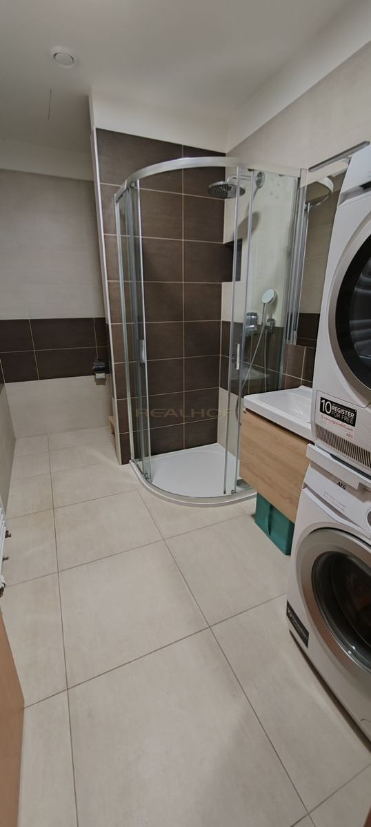 Vybavení bytu: kožená sedačka, konferenční stolek, barový pult se židlemi, nádobí. V koupelně je pračka a sušička AEG.