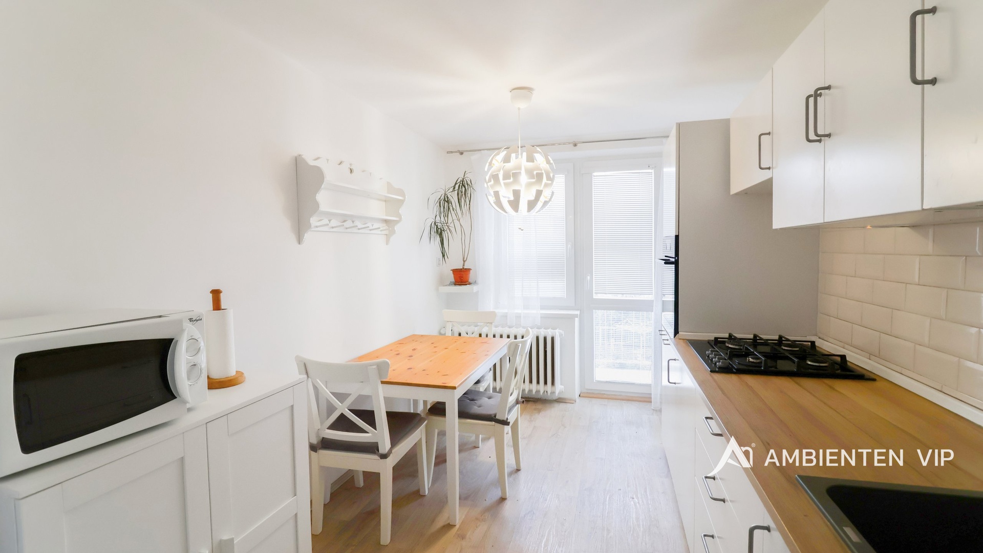 Vybavený byt se nachází ve zvýšeném 2. nadzemním podlaží cihlového domu po revitalizaci z roku 2025. V předsíni bytu se nachází velká vestavěná šatní skříň. Z předsíně je samostatný vstup do obývacího pokoje s novou rozkládací sedačkou, pracovním stolem a TV stěnou, disponující úložným prostorem. Koupelna je vybavena pračkou AEG. Kuchyně je vybavena lednicí, plynovým sporákem, troubou a myčkou. V ložnici se nachází velká manželská postel 160x200 vč. matrací. Dále se zde nachází šatní skříň, pracovní stůl, pracovní židle a smart TV.