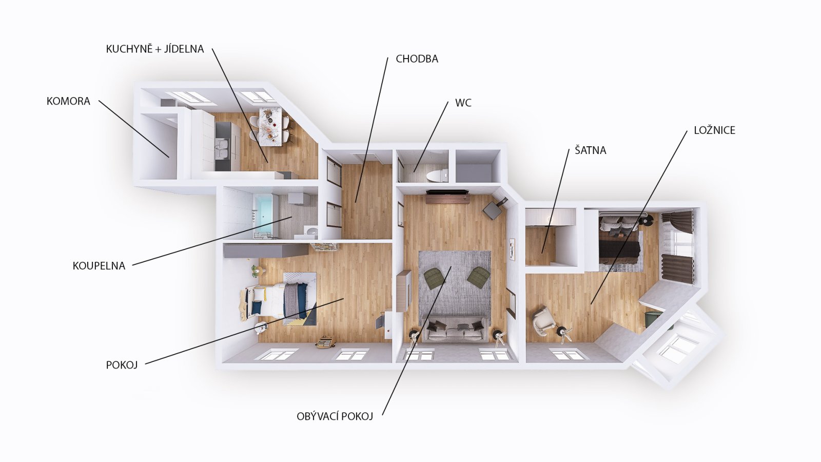 Jednotka je dispozičně řešena jako 3+1, díky čemuž můžete zapomenout na stísněné pokoje s optimalizací prostoru charakteristickou pro moderní výstavbu. Naopak – prostor i díky výšce stropů přes 3 metry působí velice vzdušně a světle. Při pobytu v bytě vnímáte jeho atmosféru, kterou ještě umocňují velká oblouková okna.