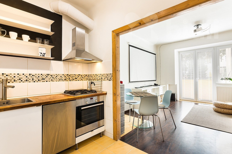 Kuchyně je prakticky oddělená a vybavená kuchyňskou linkou se spotřebiči.