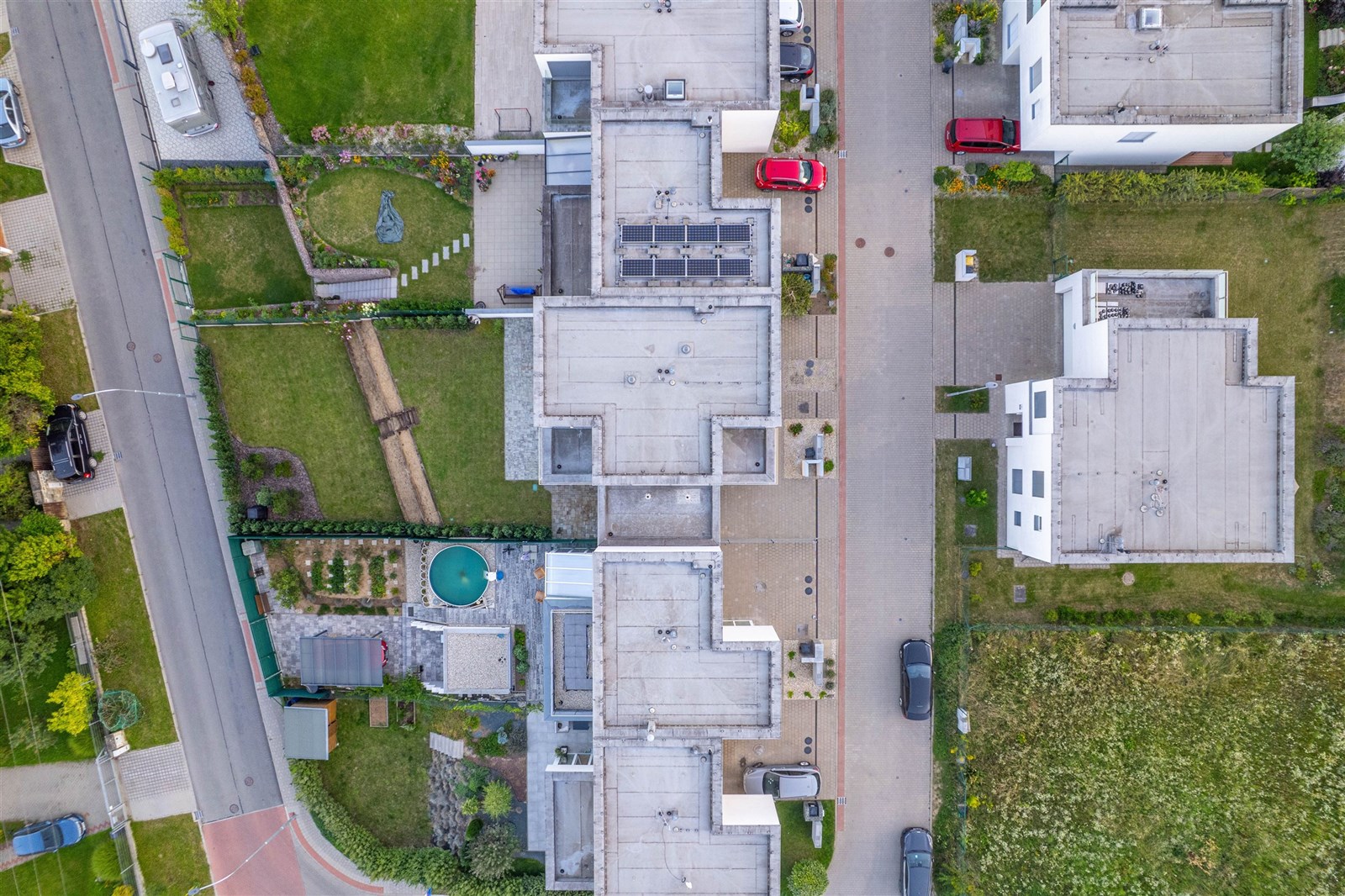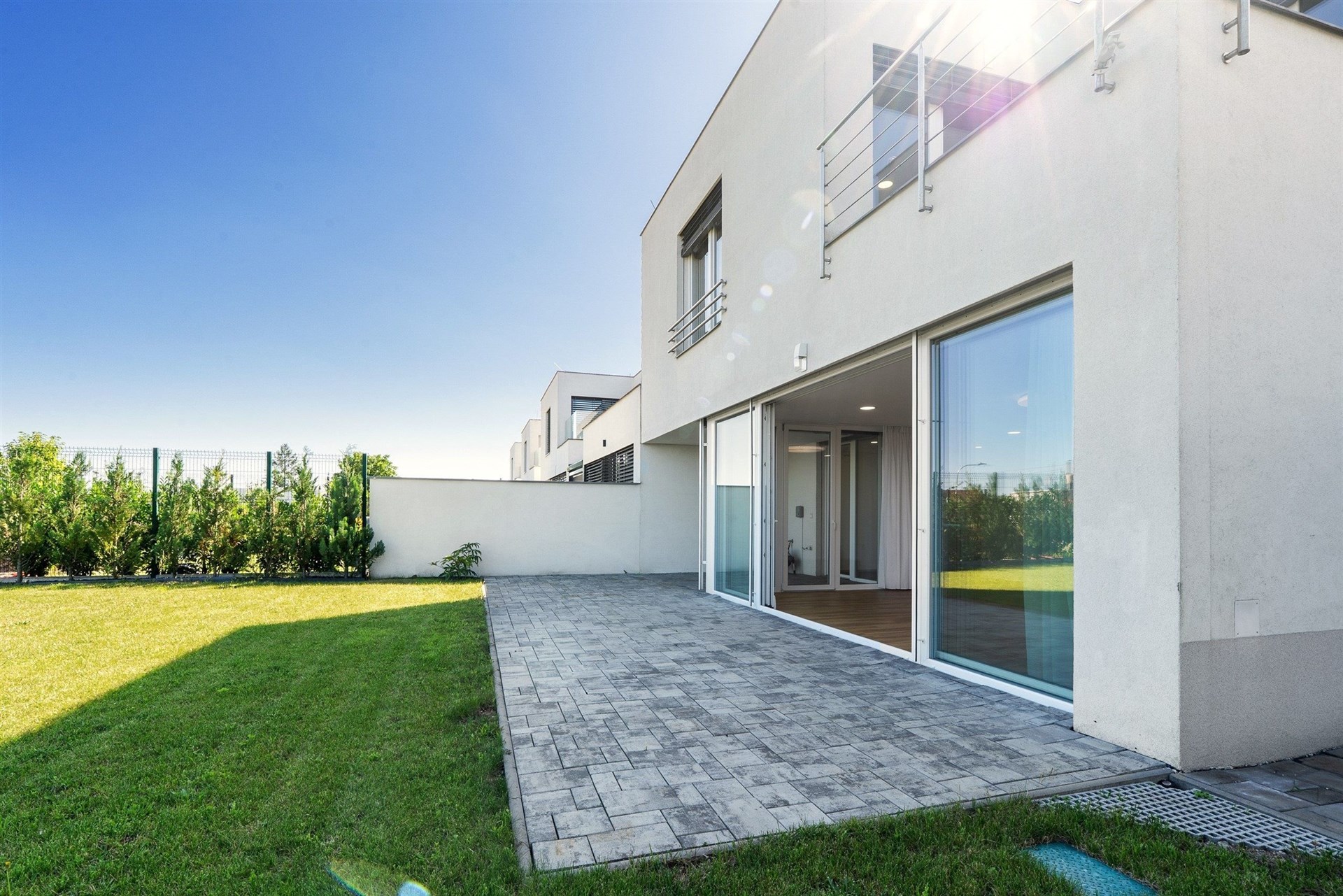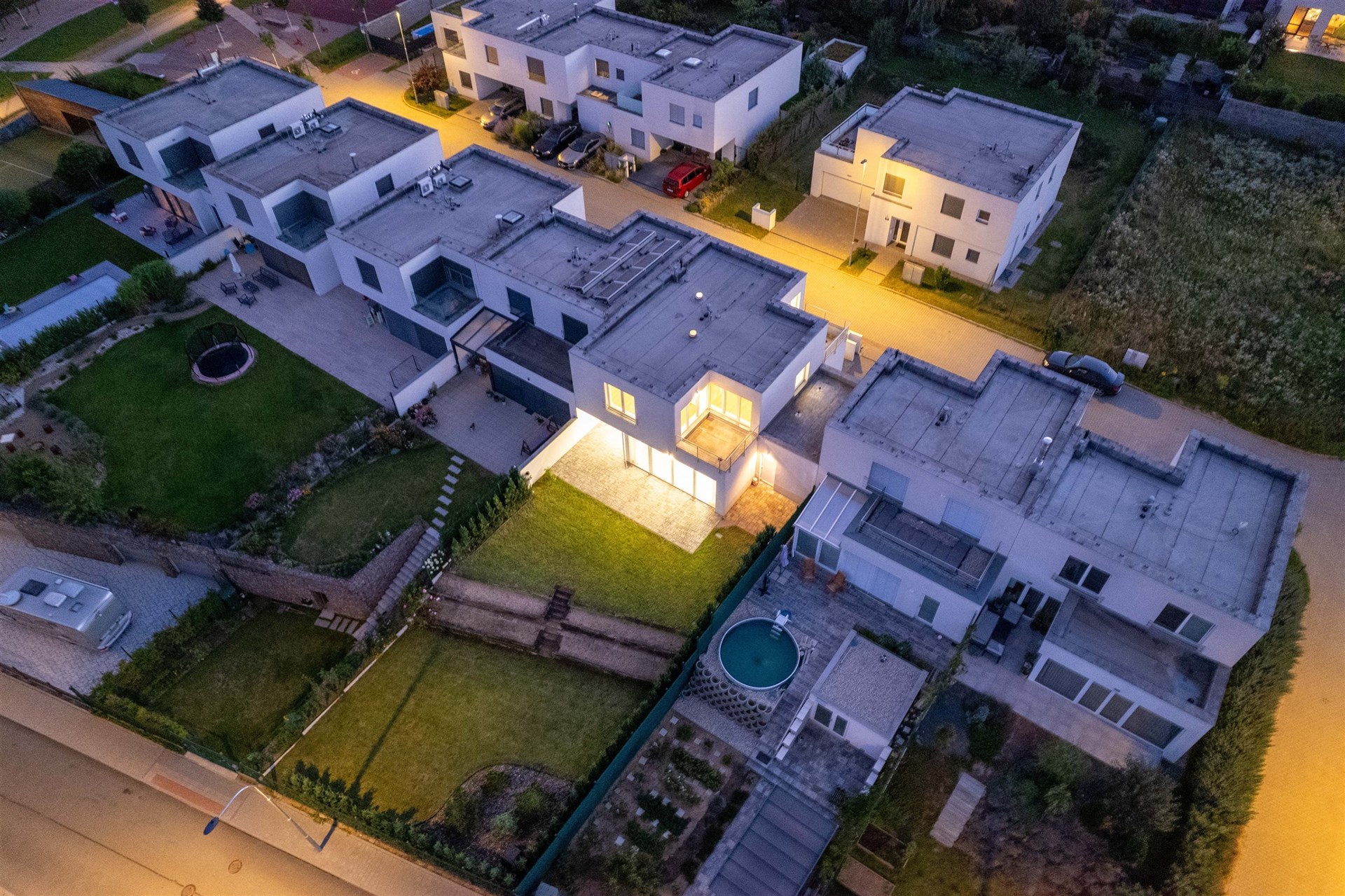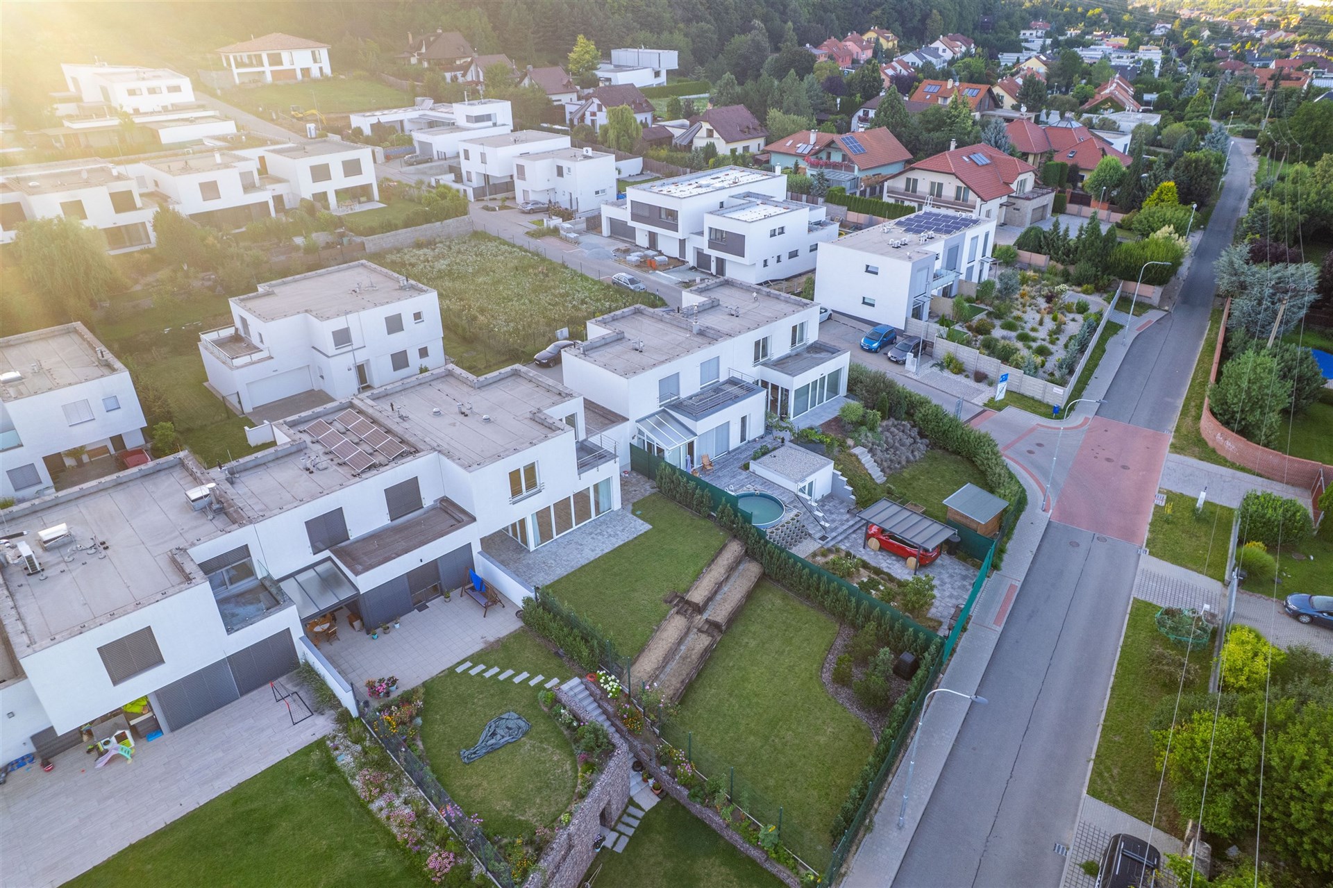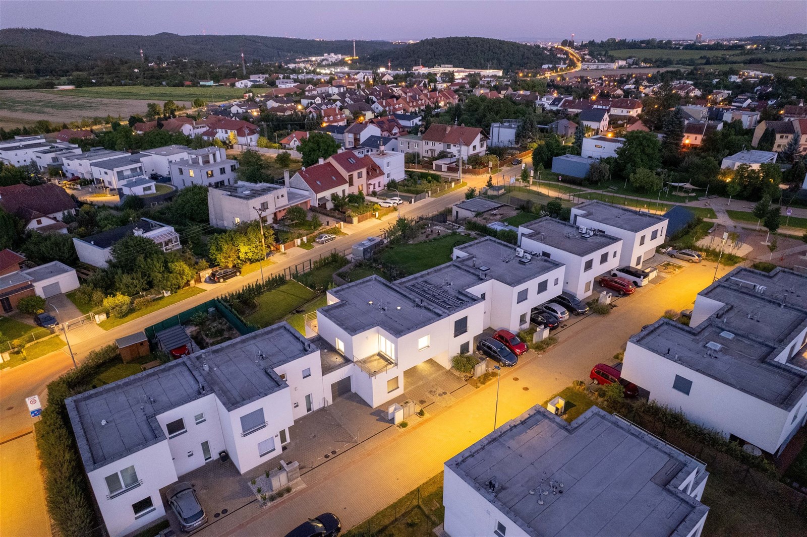 Dům působí jako elegantní městská vila, přes den funguje jako komfortní rodinné zázemí s promyšleným oddělením denní a noční zóny, večer se díky velkoformátovému prosklení přirozeně otevírá do zahrady a teras. Užitná plocha 213 m² (podlahová 175 m²) dává dostatek prostoru celé rodině, k tomu kaskádová zahrada 289 m², garáž pro 1 auto a dvě parkovací místa před domem. Praktickým bonusem je druhý vstup na zahradu z ulice Hatě a automatická závlaha napojená na retenční nádrž.