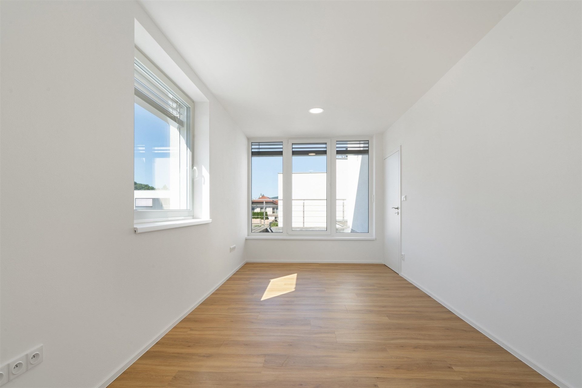 V patře najdete tři neprůchozí pokoje (dva orientované do zahrady), šatnu, skladovací místnost a koupelnu s vanou, sprchovým koutem a WC. O příjemné soukromé zázemí se starají dvě terasy, na které se vstupuje z různých pokojů, ranní káva, večerní víno i sušení prádla mají své vlastní místo.