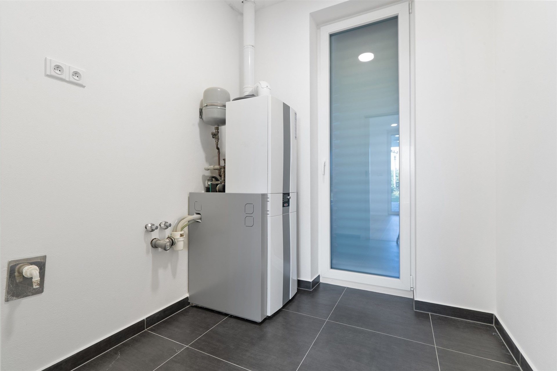 Přízemí tvoří velkoryse prosvětlený obývací prostor s jídelnou a kuchyní, ze kterého plynule vstoupíte na terasu a do zahrady. Hned u vstupu je samostatný pokoj se vstupem přímo z ulice, ideální home office, ateliér nebo místnost pro setkávání s klienty, aniž byste narušili soukromí v domě. Dále je zde koupelna se sprchovým koutem a toaletou, úložný prostor pod schody a technická místnost s plynovým kotlem; do té se vstupuje i z parkovací plochy před domem, takže skvěle poslouží třeba jako spíž dostupná z ulice i z kuchyně. Ze zahrady je průchod do garáže.