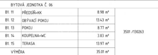 Byt č. 6 má dispozici 2+kk, plochu 35 m2 a patří k němu terasa/předzahrádka o ploše 14 m2. Nachází se v přízemí a je nasměrován na severovýchod, takže z něj uvidíte na kostel nebo sjezdovky.