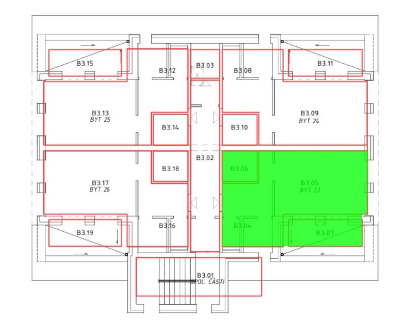 Byt č. 23 je mezonet, má dispozici 2+1, plochu 46,5 m2 a patří k němu terasa o ploše 5,3 m2. Nachází se ve 3. a 4. podlaží a budete z něj mít výhled jak na kostel nebo sjezdovky, tak i směrem do Německa.