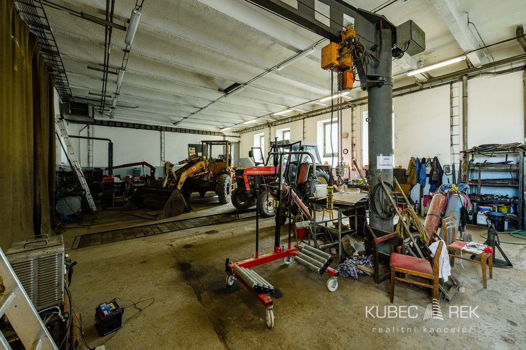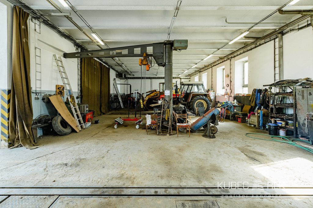Technické zázemí areálu zahrnuje 5 garáží pro nákladní vozidla s vysokými vjezdy, dílny se zdviží, sloupovým jeřábem a servisní jámou s heverem.