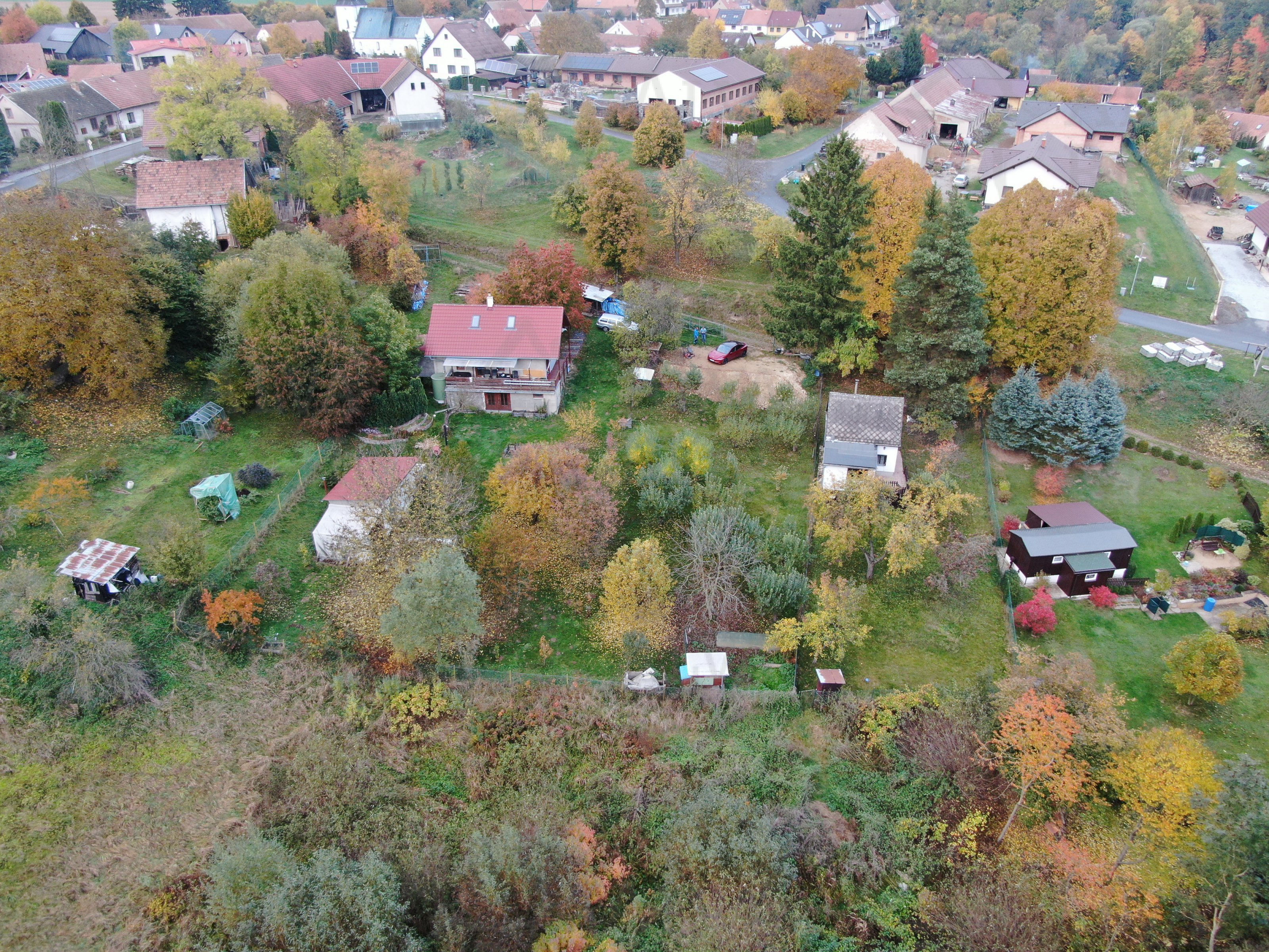 klidná část obce, vzrostlá zeleň, říční niva s potokem cca 200 metrů od pozemku (mimo záplavové území, zanedbatelné povodňové riziko).