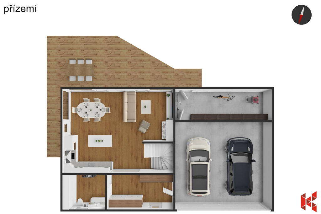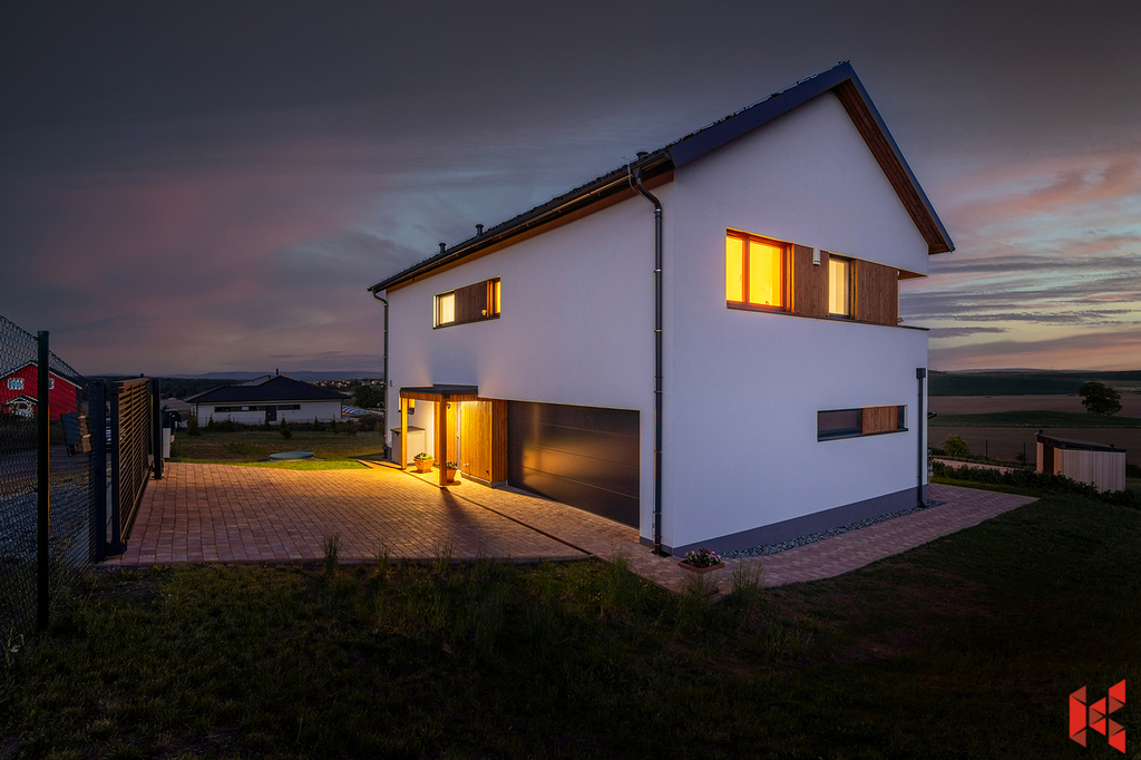 ✔ Dvojgaráž s přímým vstupem do domu a přípravou na elektro nabíjení