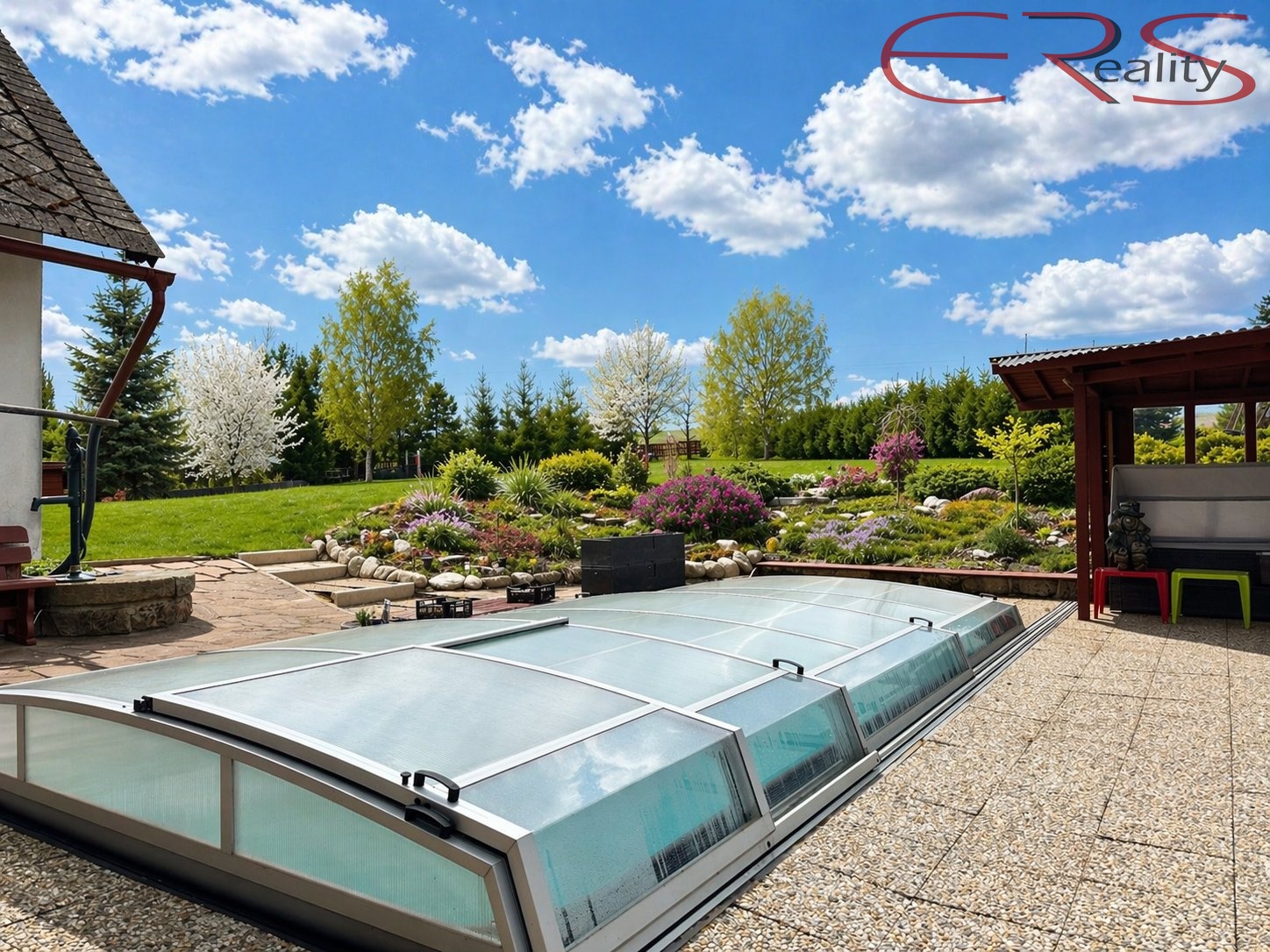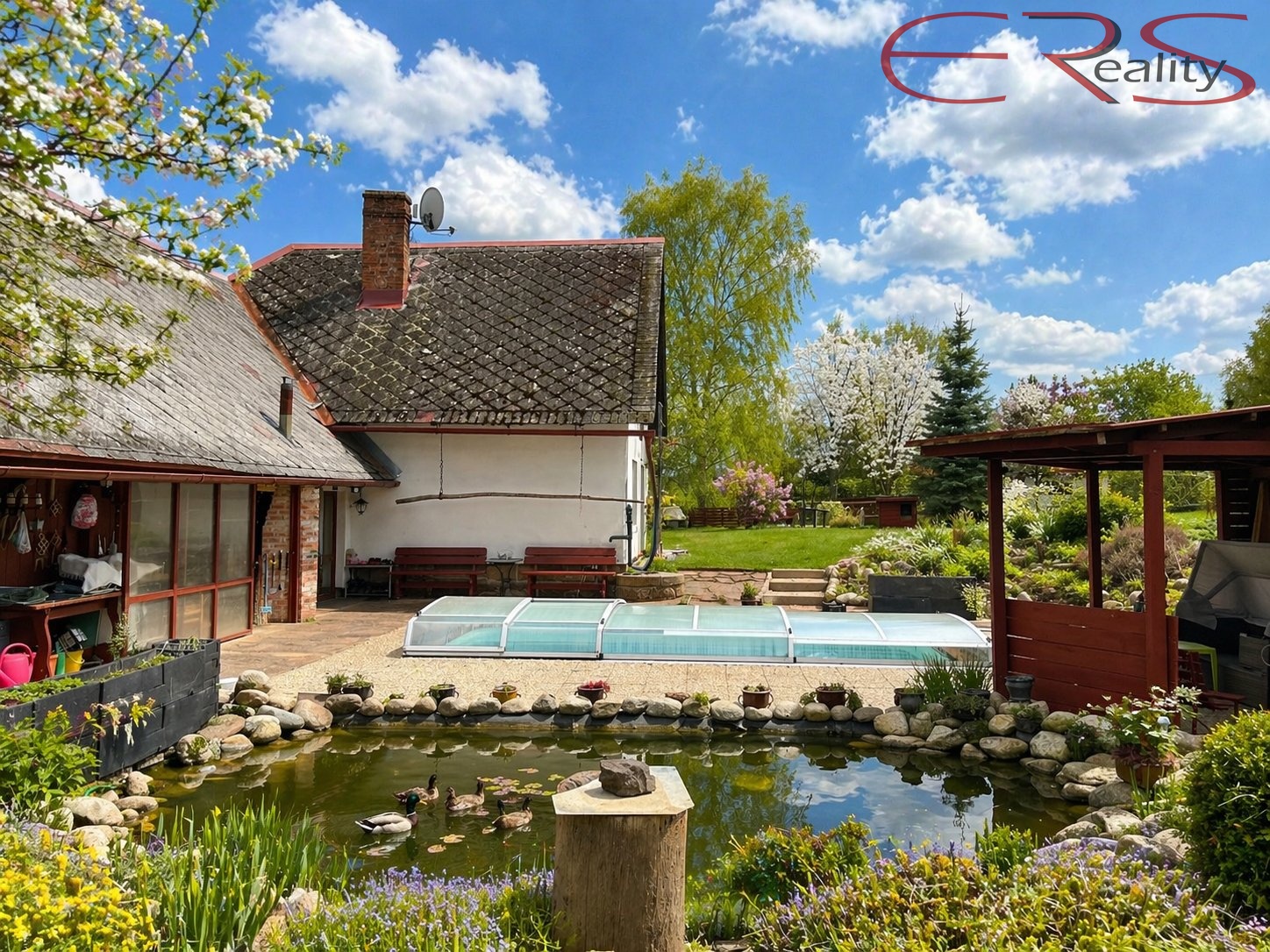 A teď to hlavní, co z téhle nabídky dělá spíš malý soukromý svět než obyčejný dům. Pozemek o výměře 3.938 m² je oplocený a nabízí prostor, který dnes většina lidí zná už jen z vyprávění nebo z pohádek, kde za chalupou bývá louka, voda a klid. K dispozici je vedlejší stavba, kryté stání pro dva automobily, bazén 6 × 3 m se slanou vodou, dětské hřiště, trampolína a také rybníček s divokými kachnami. Ano, opravdu. Některé domy mají maximálně túje a plastového čápa. Tady máte vlastní vodní scénu.