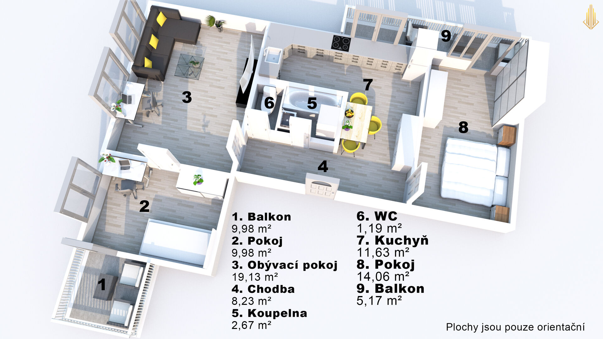 Dvě ložnice, každá s vlastním balkónem (celkem 7,7 m²)