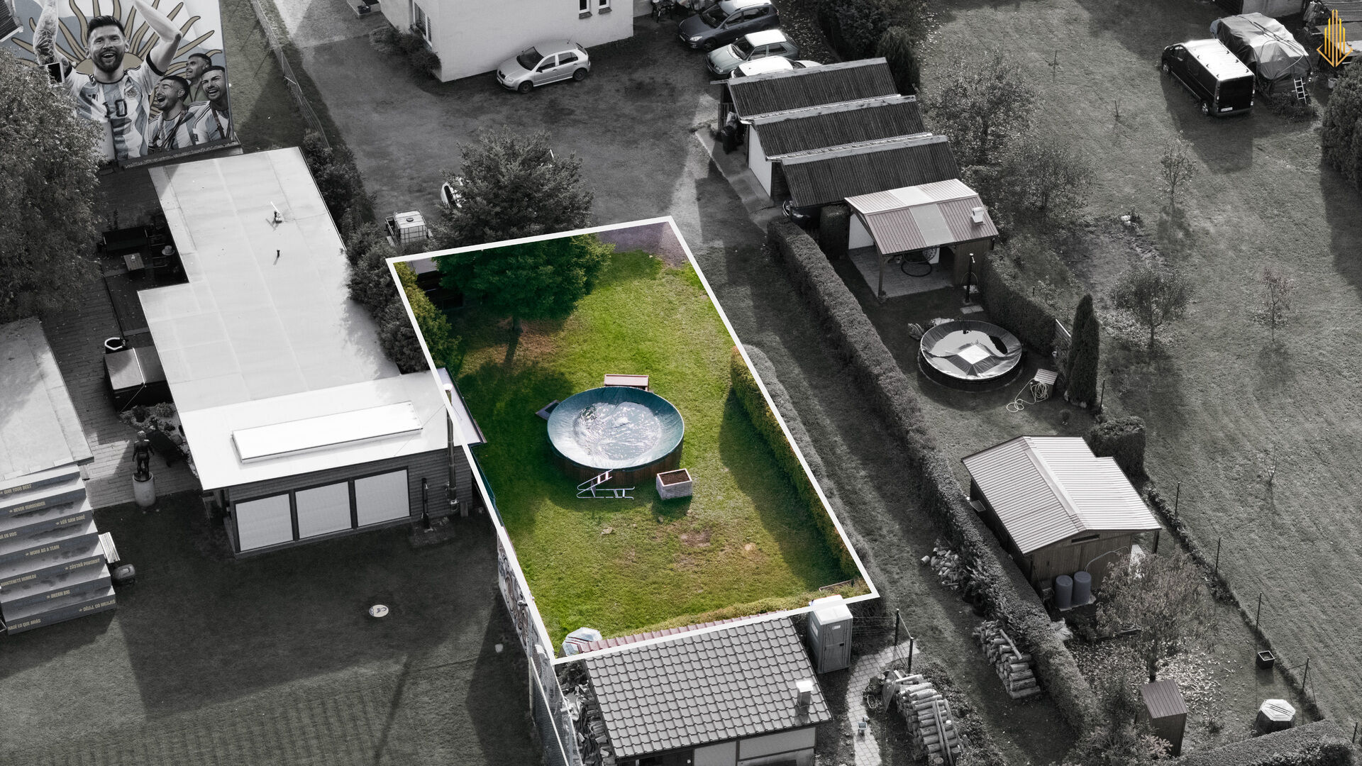 Zahrada 250 m² s bazénem, filtrací a vysavačem, solární sprcha, venkovní kuchyňka s přívodem vody a odpadem
