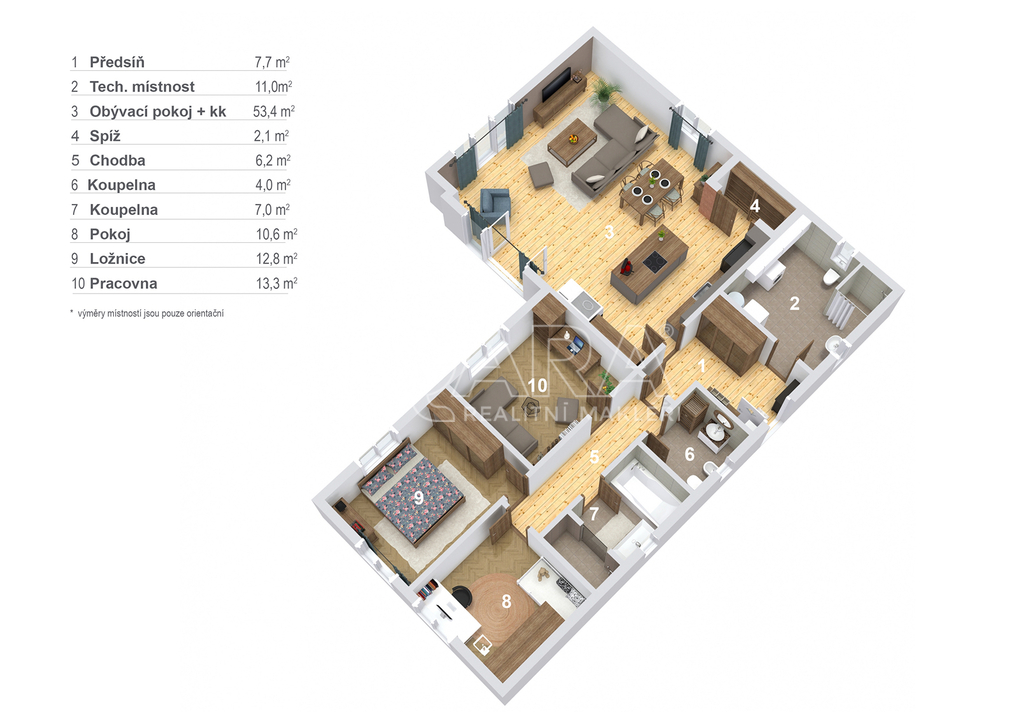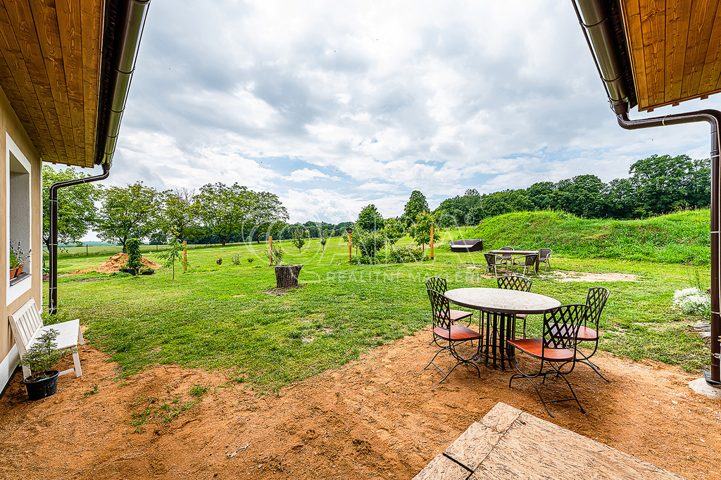 Dům z roku 2021 a má jedno podlaží do písmene L, kde najdete předsíň, technickou místnost, WC s bidetem, prostorný obývací pokoj, moderní kuchyni s ostrůvkem a spíží, koupelnu s vanou a sprchovým koutem, a tři samostatné pokoje.
