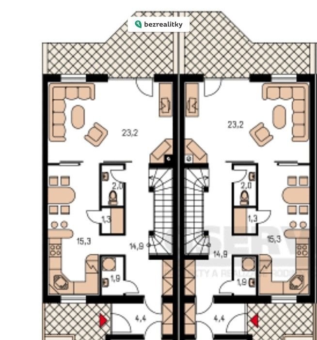Užitná plocha každé jednotky je 123 m2 a plocha zahrad 380 m2 a 394 m2.