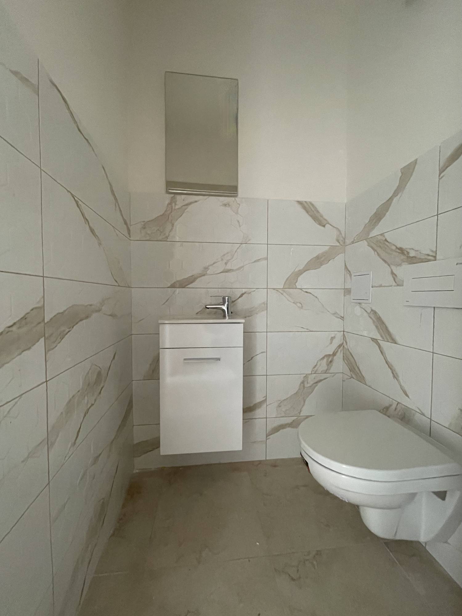 První patro – Obývací pokoj, kuchyně, toaleta s umyvadlem, zádveří, prostor pod schody, technická místnost a komora.