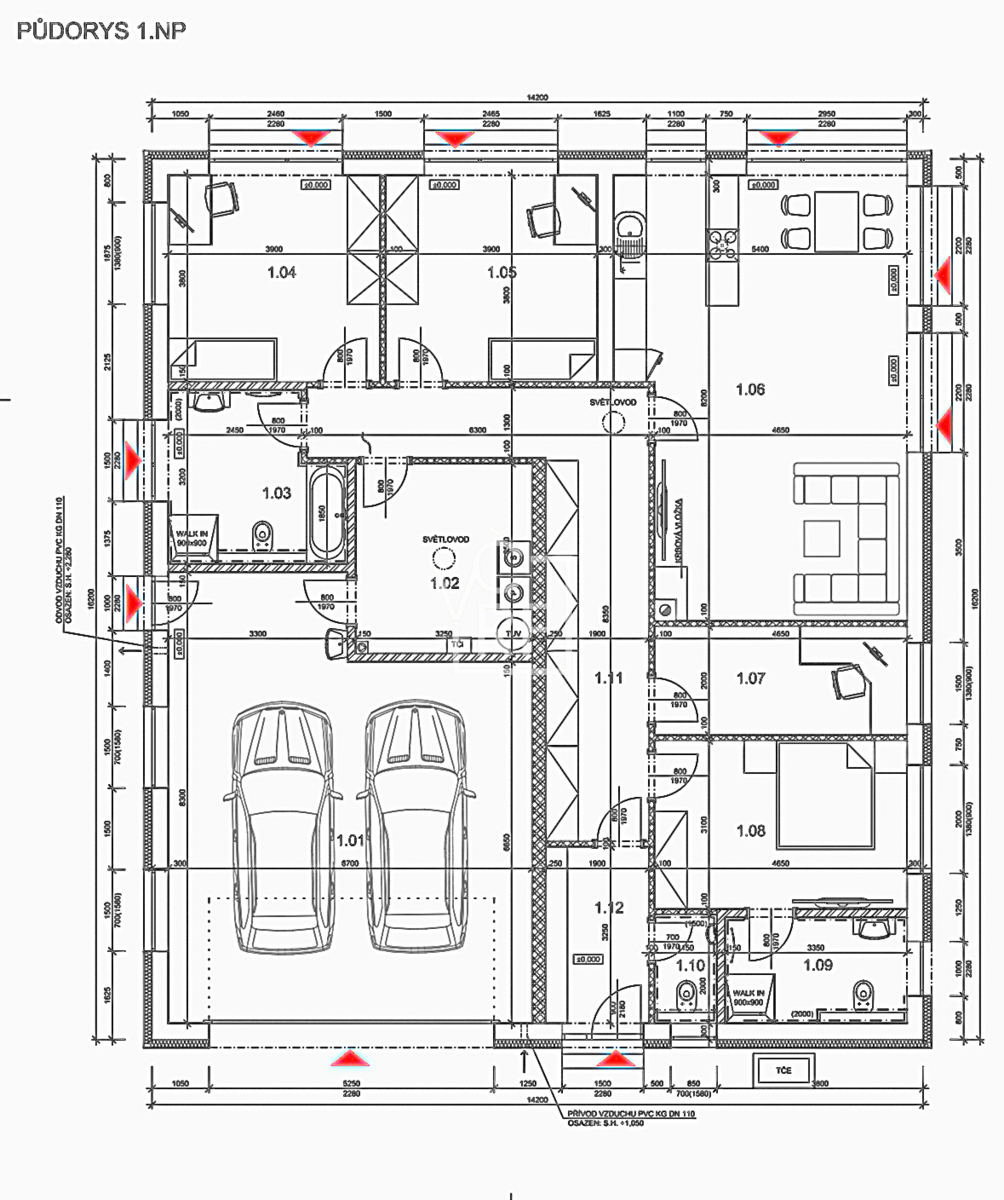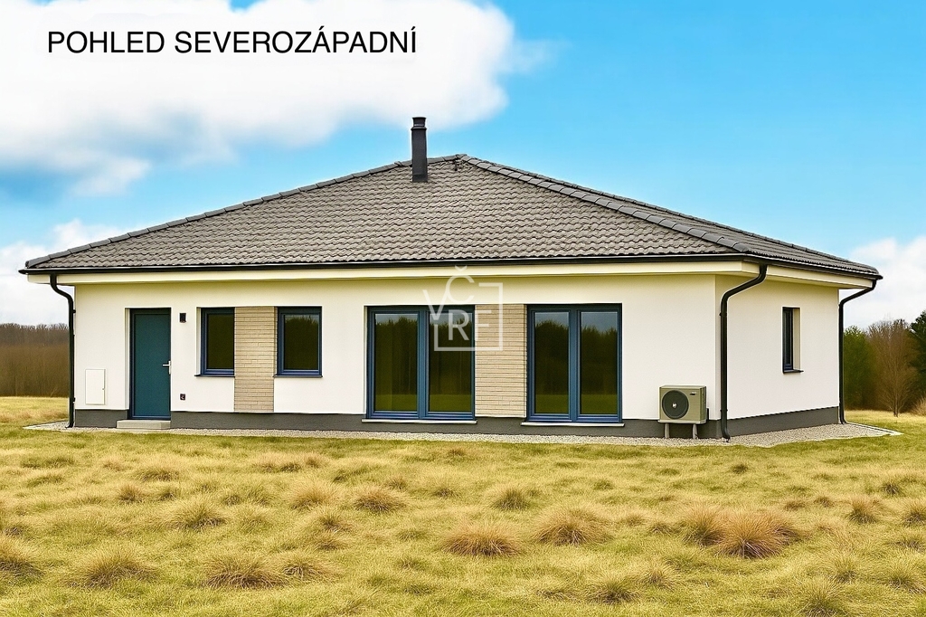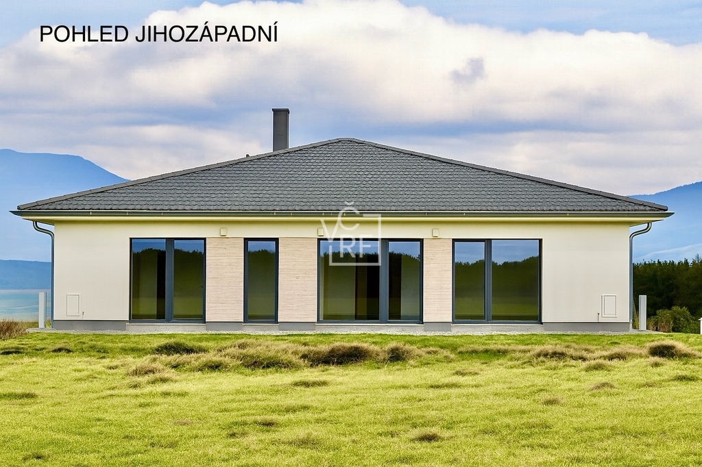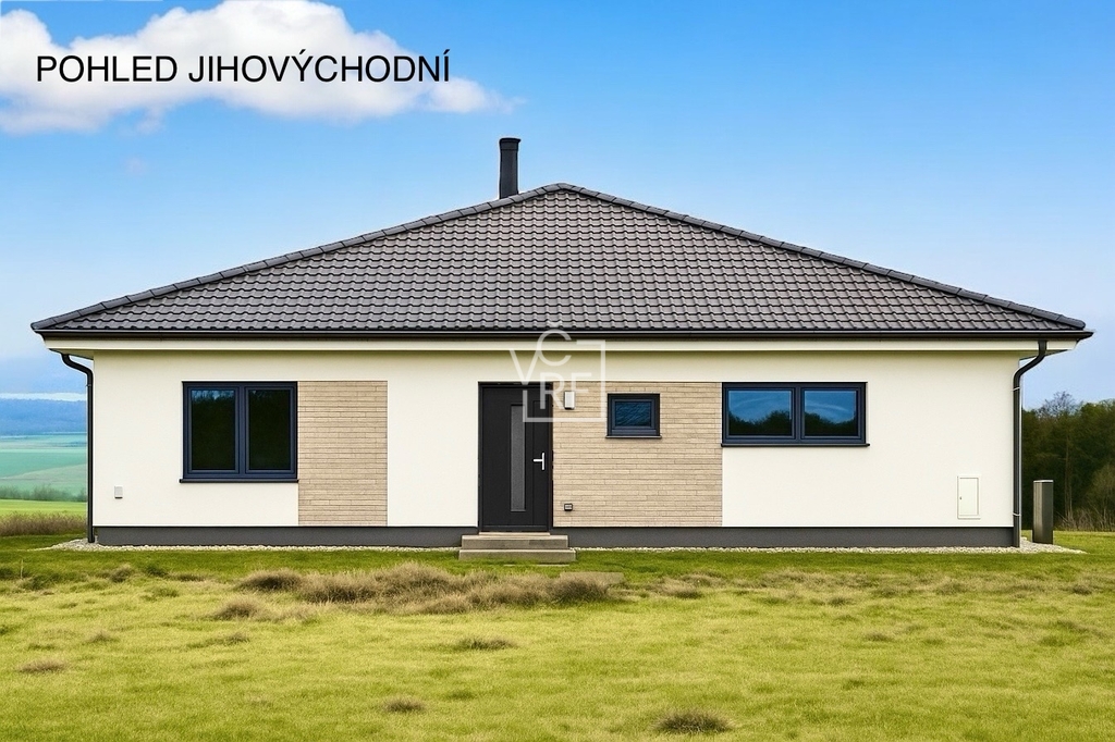 •Dispozice RD: centrální chodba, ložnice s koupelnou a WC, pracovna, prostorný obývací pokoj s krbem spojený s kuchyní, dva dětské pokoje, koupelna s vanou, sprchovým koutem a WC, technická místnost a již zmíněná garáž.