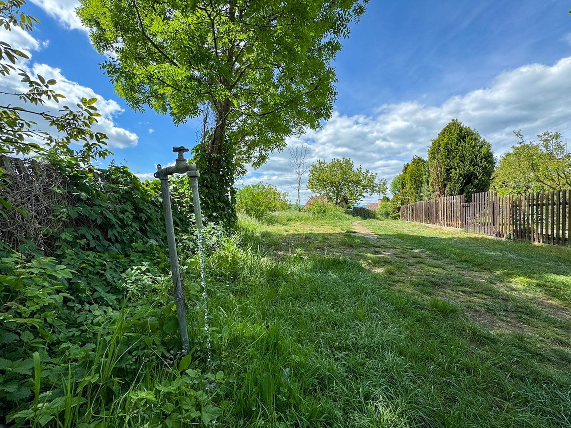 Zahrada je ve svahu s terasovitými záhony. Je tu místo na posezení i ohniště a kromě vzrostlých jabloní zde najdete např. broskev, jahody, rybíz i opečovávané skalky.