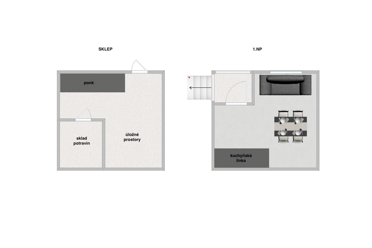 V přízemí je obytná místnost s rozkládací sedačkou, posezením a "suchou" kuchyní. Půda je vhodná na skladování sezonních potřeb a ve sklepě je pak dostatek úložných prostor, pracovní ponk a izolovaný prostor pro úschovu potravin.