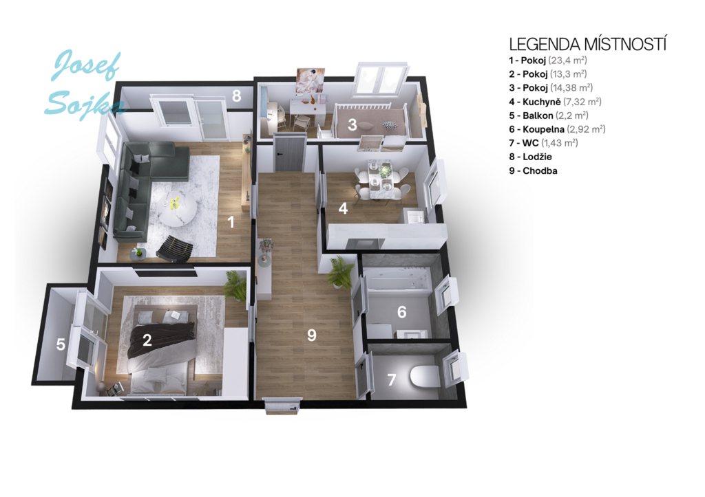 Dispozice: pokoj 23,43 m2 s lodžií 3,48m2
