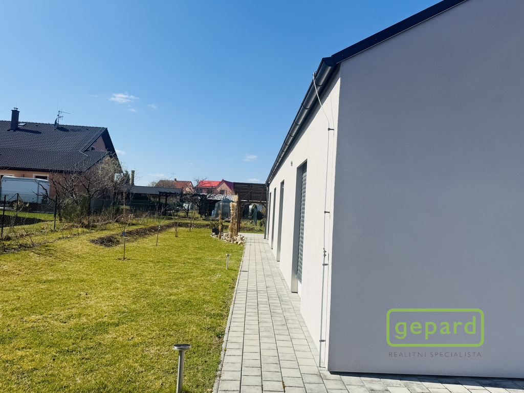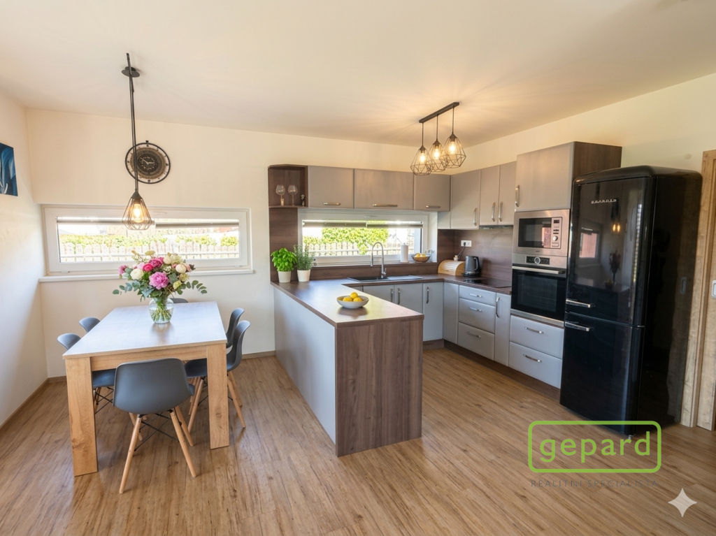 Dům je zděný z cihel Heluz 35 cm a kvalitně zateplený 20 cm vrstvou polystyrenu, střecha sedlová s plechovou střešní krytinou. Přes celý dům je k dispozici pochozí půda, kde máte možnost uskladnit nejen sezónní záležitosti. Na jižní stranu domu jsou situována v každé místnosti velká francouzská okna, která vám zaručí po celý den dostatečný příjem světla a nechybí předokenní žaluzie na dálkové ovládání, které vám zajistí soukromí a jistě je oceníte i v letních měsících. V celém domě je kvalitní vinylová podlaha, dveře a zárubně značka Sapeli. Dům disponuje 2 koupelnami, kdy v jedné je k dispozici vana a topný žebřík, ve druhé koupelně pak sprchový kout a toaleta, které jsou oddělené skleněnou stěnou. Druhá samostatná toaleta je hned vedle pokoje. V obývacím pokoji nechybí krbová kamna na dřevo/brikety bez výměníku, která zpříjemní dlouhé zimní večery. Na obývací pokoj navazuje kuchyňská část, která disponuje prostornou kuchyňskou linkou do tvaru U s vestavěnými spotřebiči značky Bosch a Gorenje (varná deska, digestoř, myčka, mikrovlnná trouba, pečící trouba) a volně stojící lednice s mrazákem.