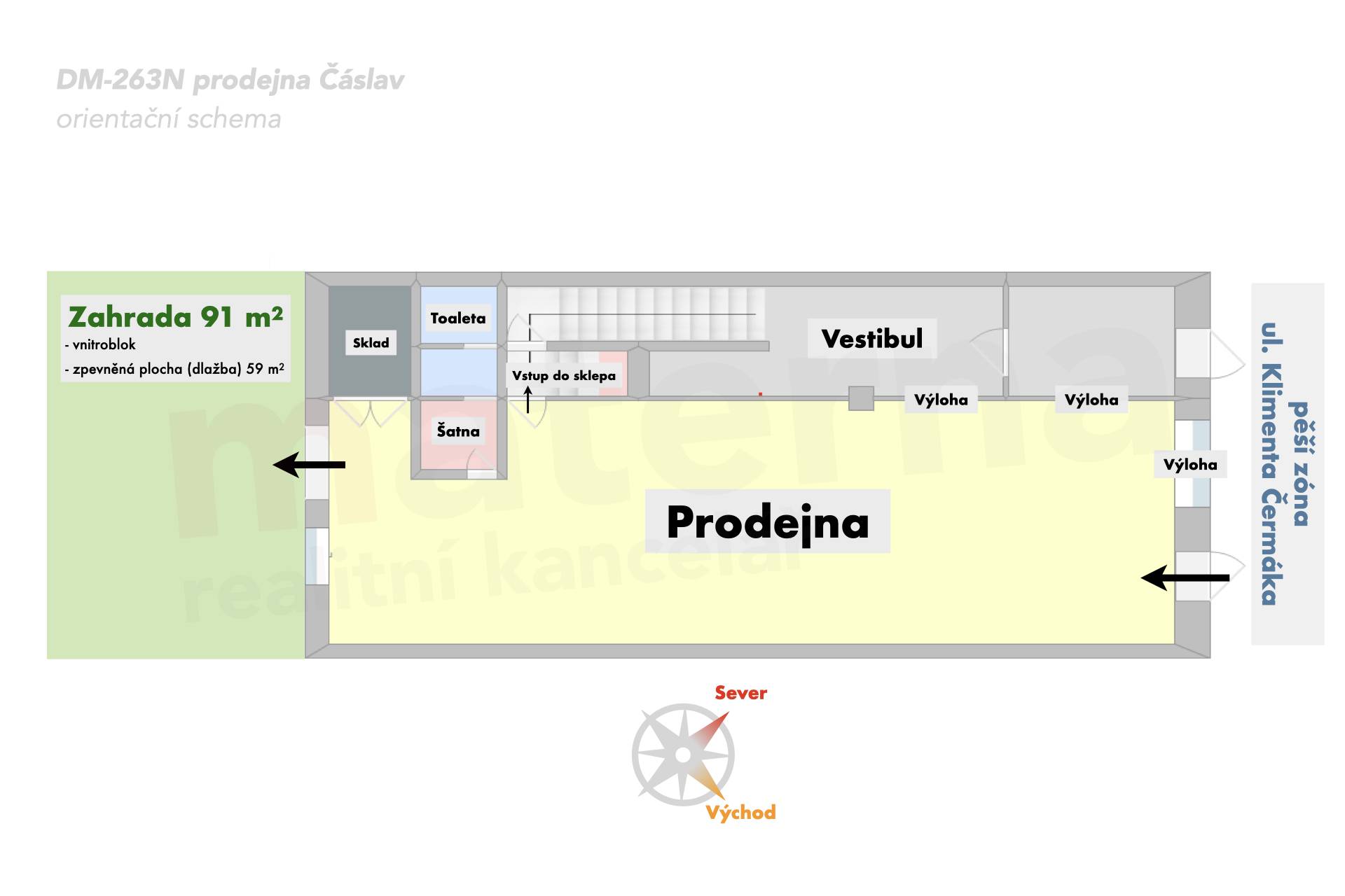 Frekventovaná ulice v centru města. Zaručená výše provozních nákladů. Předmětem pronájmu je obchodní jednotka s vlastní zahradou a sklepem, která se nachází v přízemí (1. NP) činžovního domu po rekonstrukci na pěší zóně v Čáslavi (ul. Klimenta Čermáka). Prostor sestává z vlastní prodejní plochy s příručním skladem, šatnou, toaletou a výlohou (114,2 m2), dále jihozápadně orientované zahrady (91 m2), a dále prostorného sklepa. Vytápění je ústřední, plynové. Podlahy jsou kryté keramickou dlažbou. Prostor je aktuálně kolaudován jako „prodejna průmyslového zboží“. Poplatky jsou hrazeny paušální platbou bez přeplatků či nedoplatků. Paušál obsahuje veškeré služby, včetně elektřiny a topení, s výjimkou připojení k internetu, které si nájemci zajišťují individuálně. Prostory jsou k pronájmu na dobu neurčitou. Provizi za zprostředkování platí pouze pronajímatel. Vstupními náklady pro nastěhování jsou nájemné a poplatky na první měsíc, a jistota nájemného, která odpovídá dvěma měsíčním platbám nájemného a poplatků. Celkově se jedná o zajímavou nabídku k pronájmu obchodní jednotky na frekventovaném místě v centru města, se zaručenou výší provozních nákladů. Pronajímatel není plátce DPH. Třída energetické náročnosti E. K nastěhování od 01.04.2026 nebo podle dohody (únor, březen). Kompletní sada fotografií a dokumentace ke stažení jsou k dispozici na webu realitní kanceláře. Více informací sdělí makléř.
