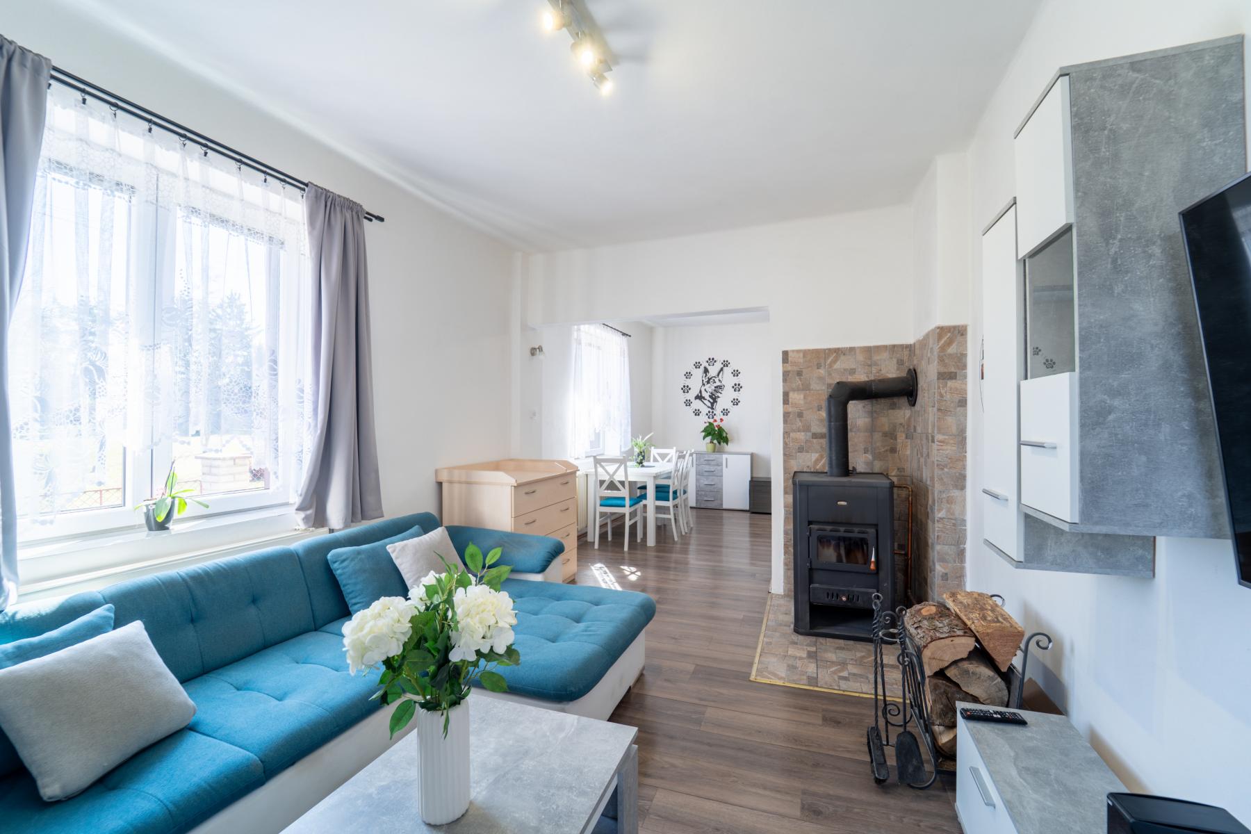 Velkou výhodou je dvojí způsob vytápění. Hlavním zdrojem tepla je plynový kotel, alternativou jsou krbová kamna s výměníkem, která nejen vytvářejí příjemnou atmosféru domova, ale zároveň umožňují výraznou úsporu nákladů na vytápění. V kombinaci se zateplením domu jsou provozní náklady velmi příznivé.