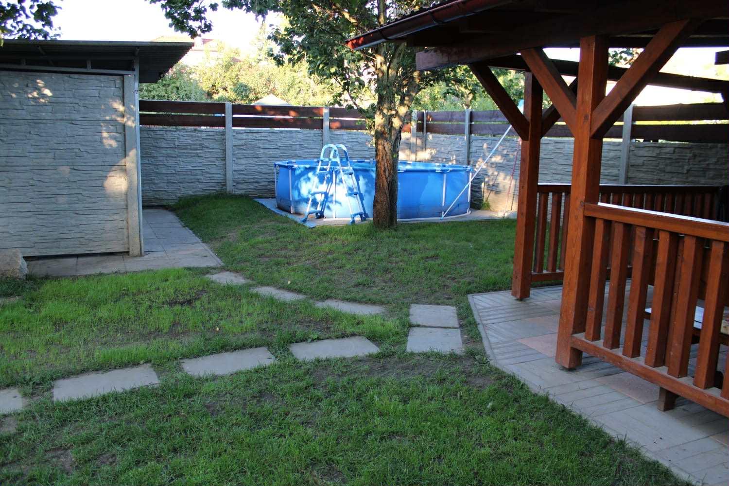 Na obytnou část navazuje garáž o výměře 14 m2 a další přístavek, který je v současnosti využíván jako společenská místnost. Na zahradě se dále nachází prostorná pergola z modřínového dřeva s kuchyňským zázemím, ideální pro letní odpočinek a posezení s rodinou či přáteli. Příjemným bonusem jsou dvě vzrostlé meruňky s pravidelnou bohatou úrodou. Součástí pozemku jsou také dva kotce pro psy, které mohou, ale nemusí být předmětem prodeje. Parkování je možné jak na vlastním pozemku, tak přímo před domem.