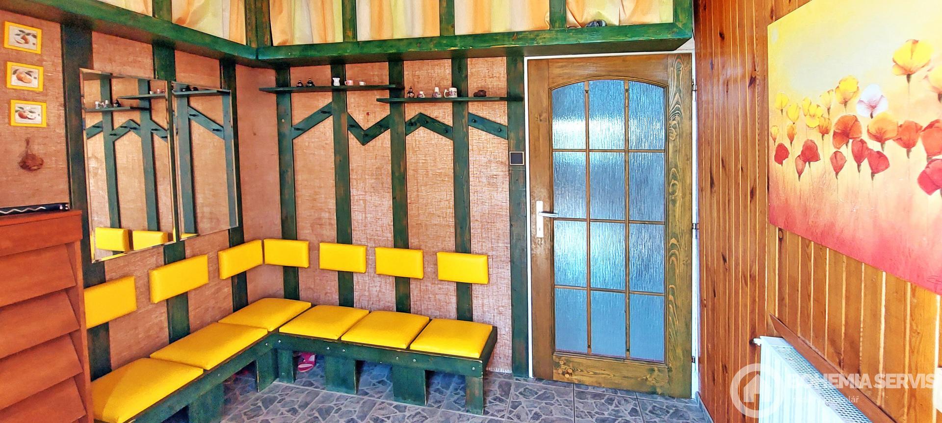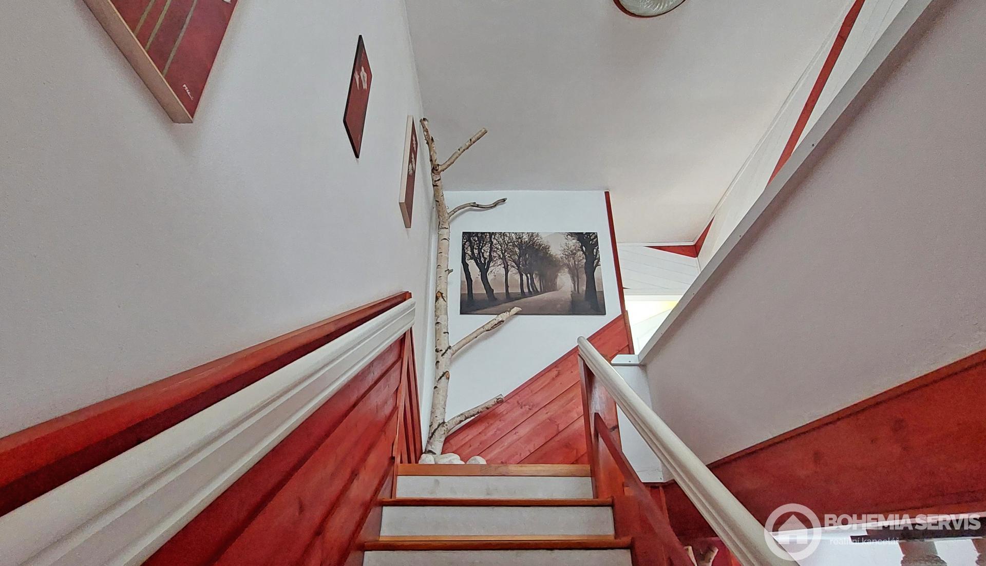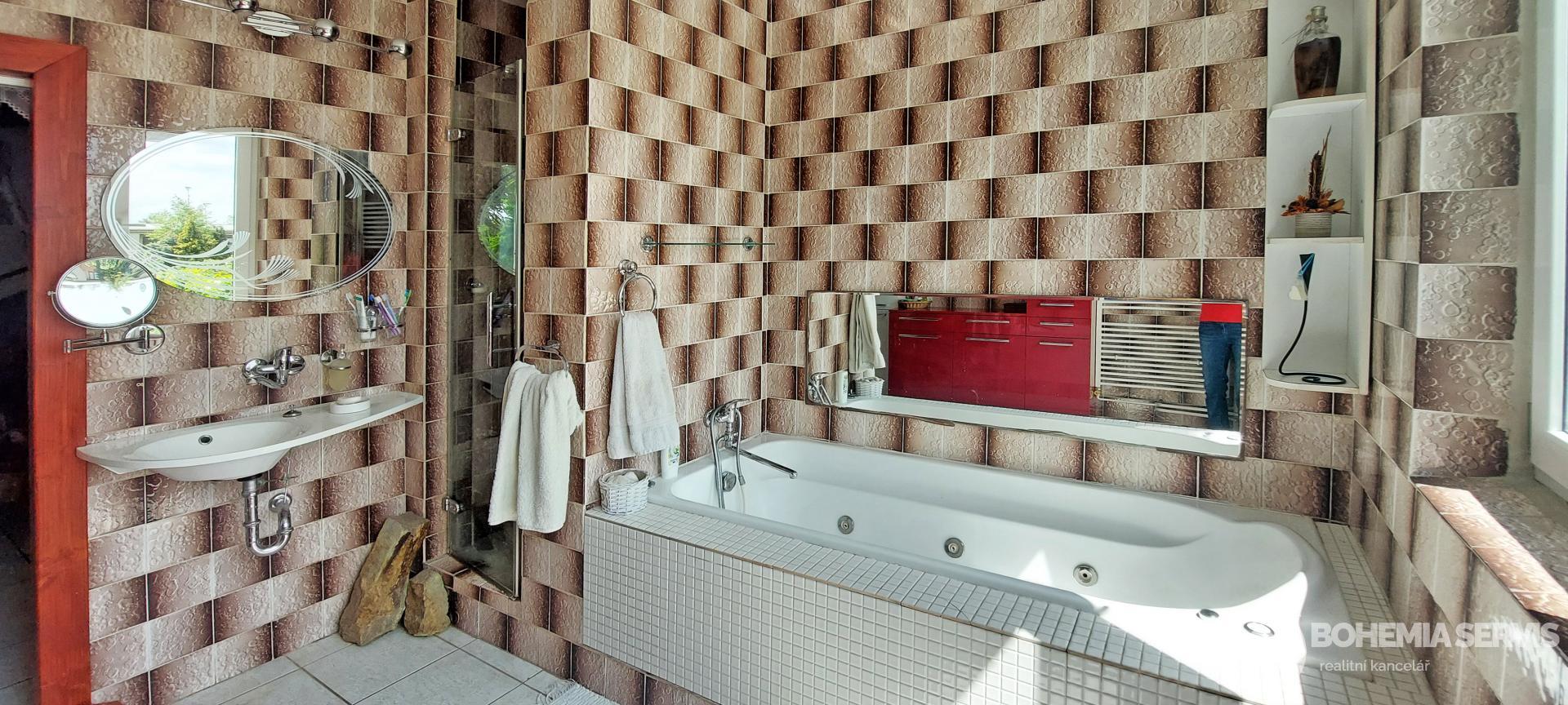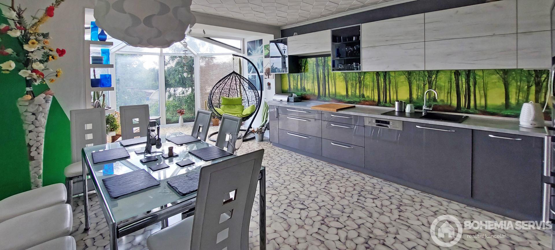 Rodinný řadový dům na jižním konci Čáslavi, užitná plocha 220 m2, s dispozicí 5+kk, pozemek 413 m2. Dům je vybavený solárními panely s dotovanou elektřinou a zateplený, klimatizací a saunou v suterénní části domu. Okrasná zahrada poskytuje jedinečné soukromí s venkovním krbem a posezením na kamenné terase. Dále zde najdeme wellness koutek s nahřívacím sudem a chatkou pro soukromou relaxaci nebo posezení s přáteli. Dispozice interiéru: ze vstupní síně je vchod do chodby, Odtud vpravo do prostorné moderní kuchyně s jídelnou a zimní zahradou s výhledem do zeleně zahrady. Tento prostor je volně propojený s obývací částí domu, která je atypická s krbem a se vstupem na lodžii, Z chodby dále vedou dveře do suterénu, na WC, koupelny a schody do 1. NP. Tam najdeme pracovnu, dětský pokoj s lodžií, ložnici s vestavěnými skříněmi i lodžií a odpočinkový otevřený prostor. Celkově je interiér velmi světlý, prostorný a vkusně zařízený.