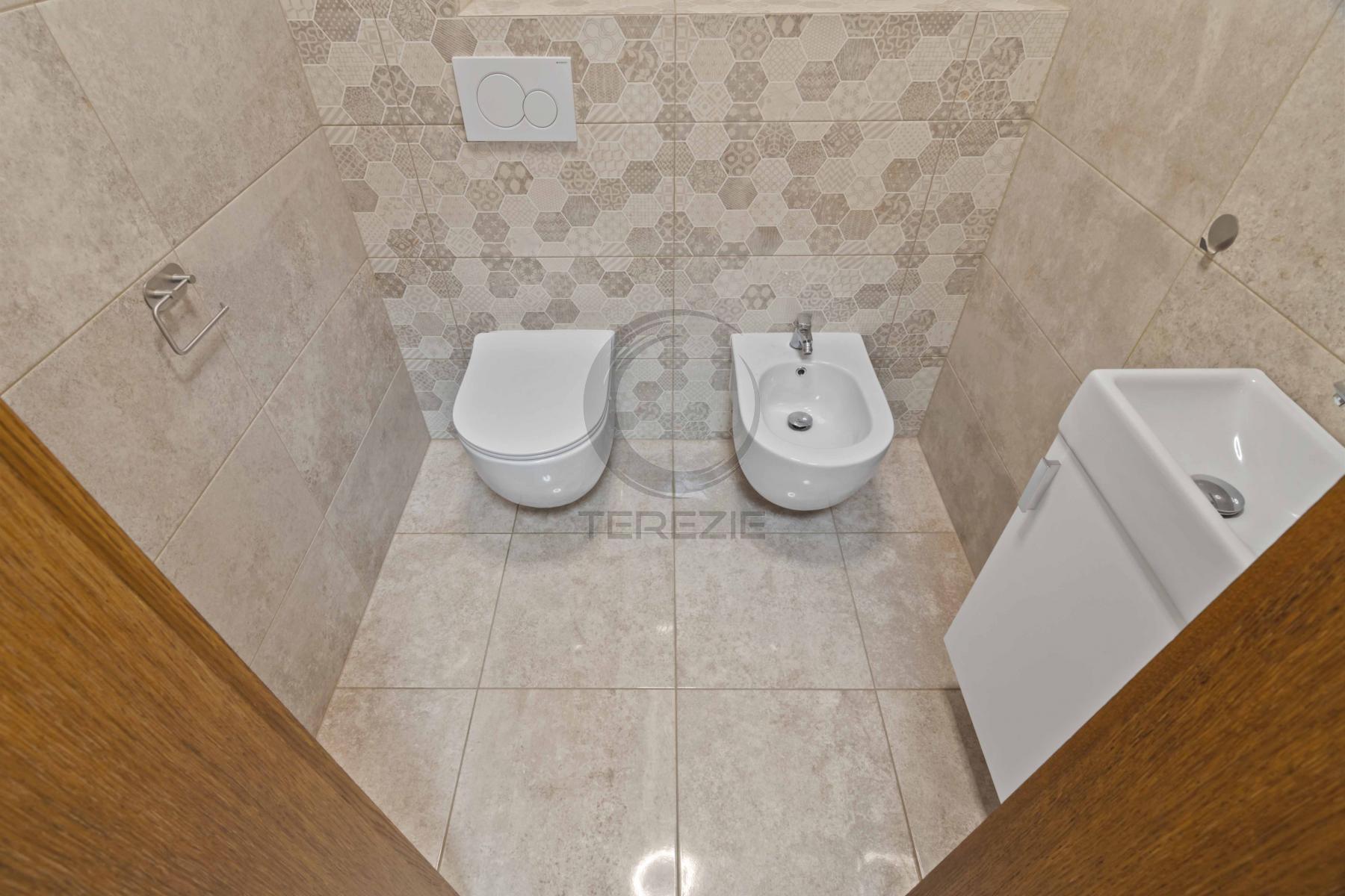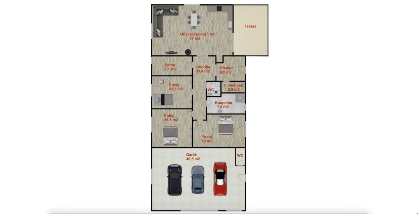 Součástí domu je i prostorná vytápěná garáž minimálně pro 3 automobily, která může sloužit i jako dílna. V garáží též najdeme samostatnou toaletu a je pamatováno i na úložný prostor, který se nachází nad celou plochou garáže.