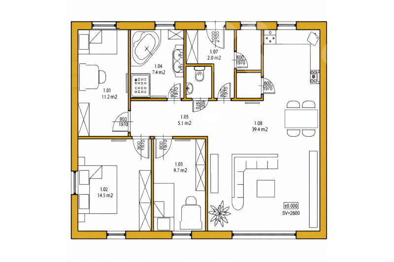 Dispozice domu je 4+kk a nabízí užitnou plochu 100 m2, promyšleně navrženou pro pohodlný každodenní život. Světlý obytný prostor plynule navazuje na zahradu a zastřešenou pergolu, která poskytne perfektní zázemí pro letní posezení, grilování nebo relax s rodinou a přáteli.