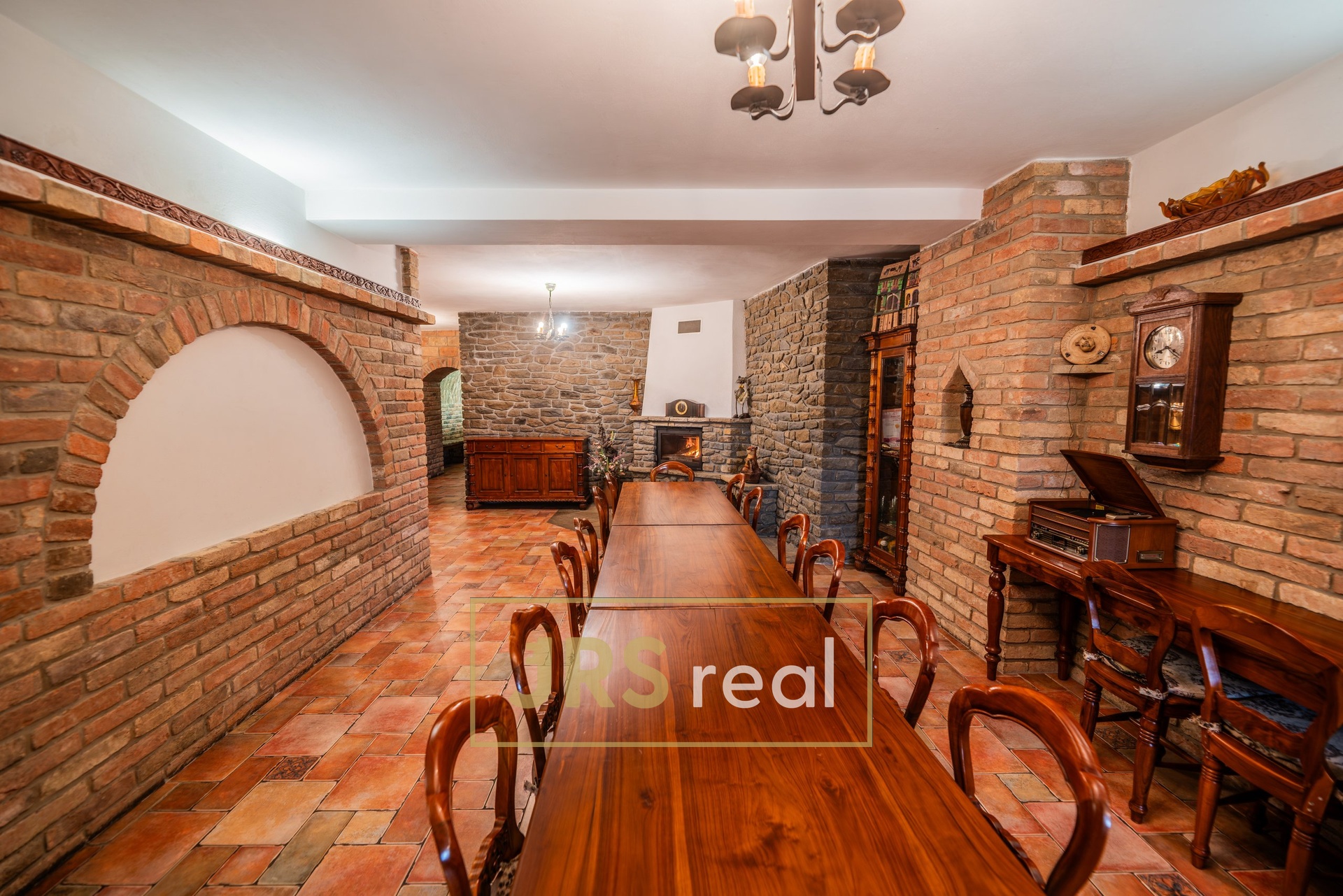 Za předsíňovými dveřmi se otevírá stylová společenská místnost s krbem, která vytváří jedinečnou atmosféru pro posezení, degustace či soukromé akce. Nechybí zde ani potřebné zázemí včetně sociálního zařízení a prostoru pro přípravu občerstvení. Na tuto část navazuje prostorná, plně vybavená kuchyně o velikosti 19 m².