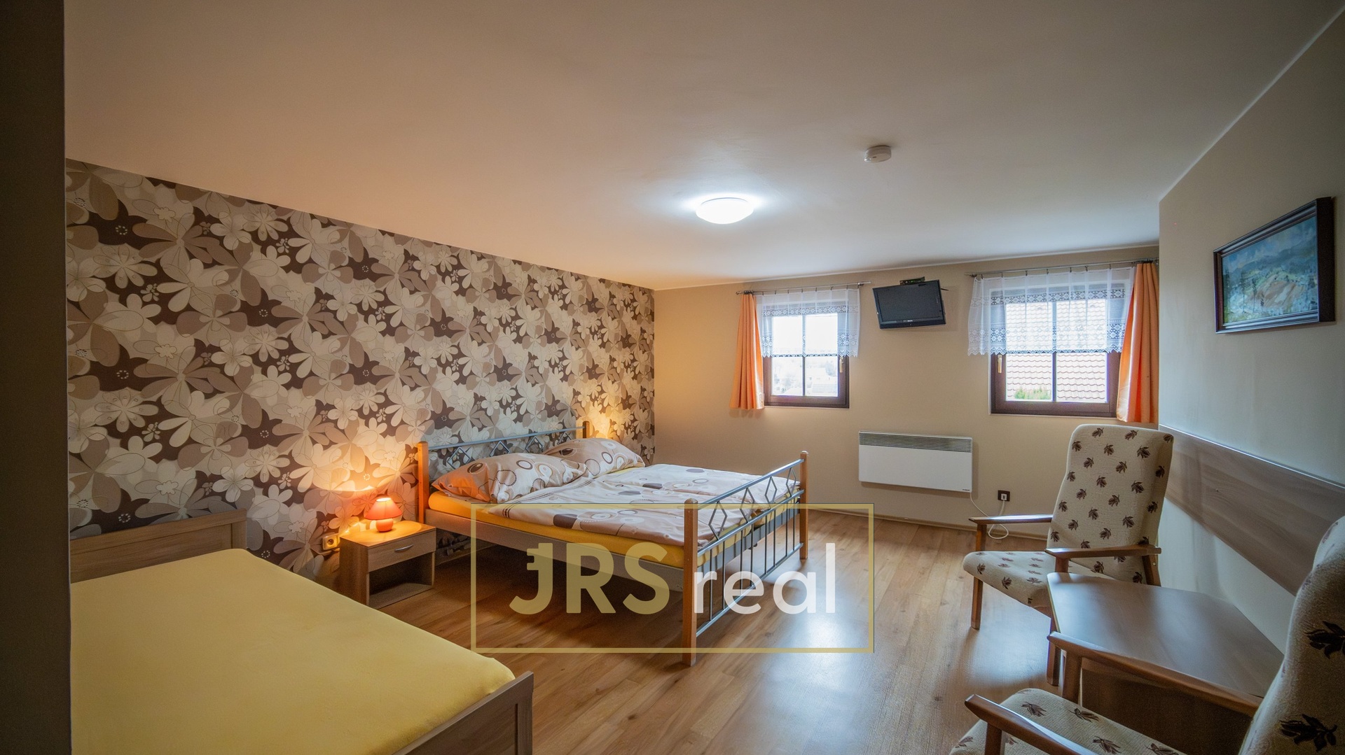 Po vstupu do nemovitosti Vás přivítá chodba, odkud vede schodiště do obytné části, kde se nachází 5 útulných, plně vybavených pokojů s celkovou kapacitou 11 lůžek. Každý pokoj disponuje vlastním sociálním zázemím – koupelnou se sprchovým koutem a toaletou, což zajišťuje maximální soukromí a pohodlí pro hosty.