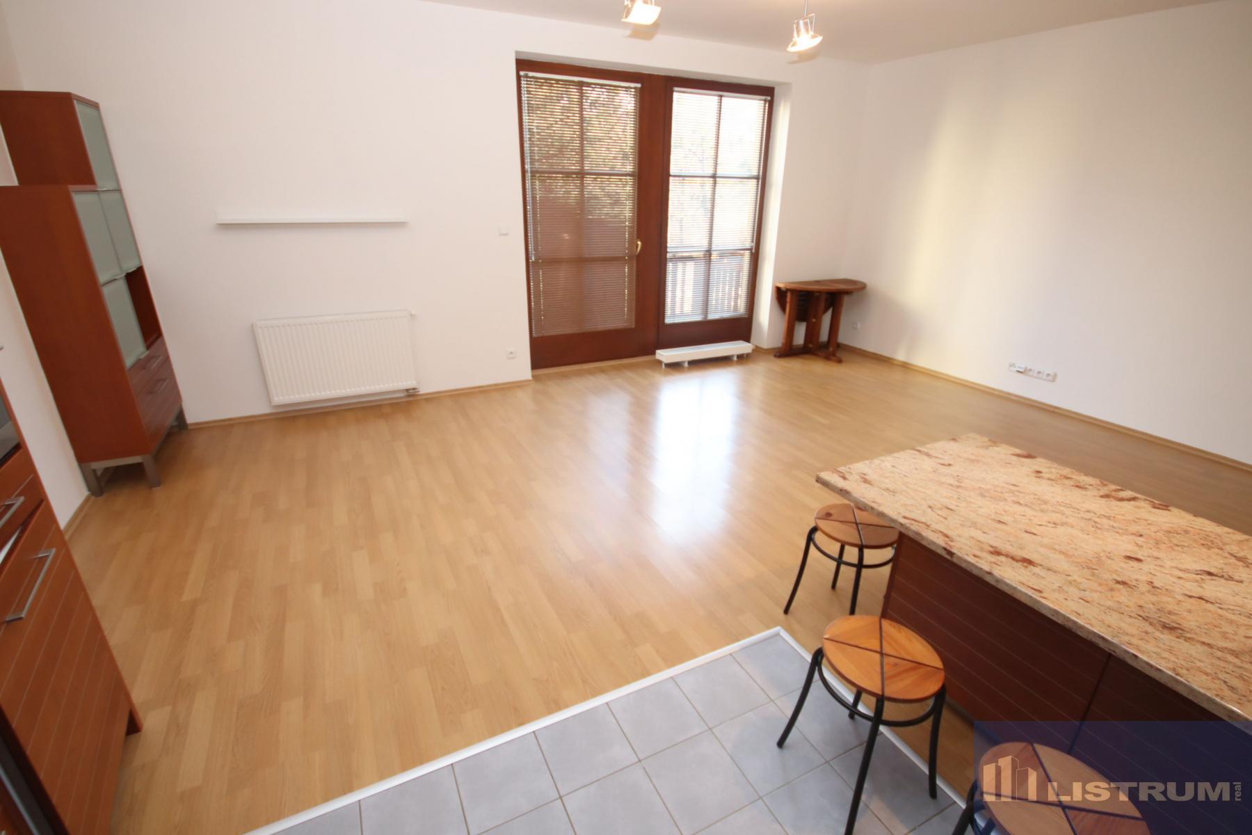 Byt je tvořen obývacím pokojem s jídelnou a kuchyňským koutem (výměra 35 m2) s kuchyňskou linkou na míru včetně vestavěných spotřebičů a se vstupem na balkón, ložnicí (výměra 12 m2), koupelnou s WC (výměra 6,3 m2) a chodbou s vestavěnou skříní (výměra 7,2 m2). K bytu náleží sklep.