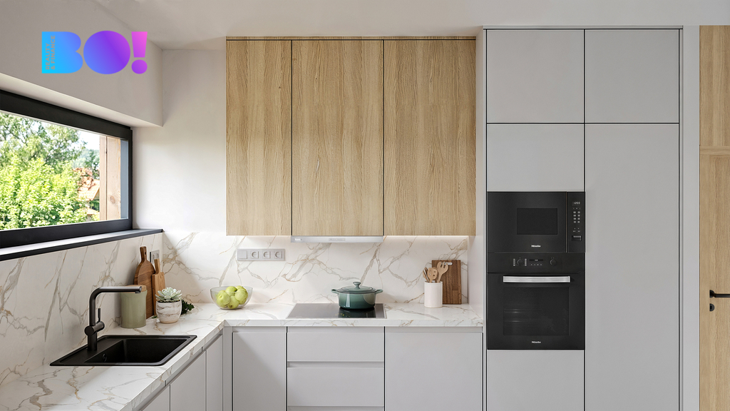Interiér je navržen v duchu přírodních materiálů a kvalitního zpracování – světlé dřevěné podlahy, velkoformátová dlažba, koupelny od studia Elements, sanita Villeroy & Boch a moderní kuchyně Miele se všemi vestavěnými spotřebiči.