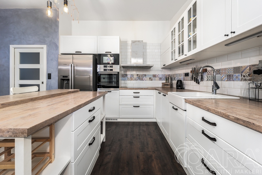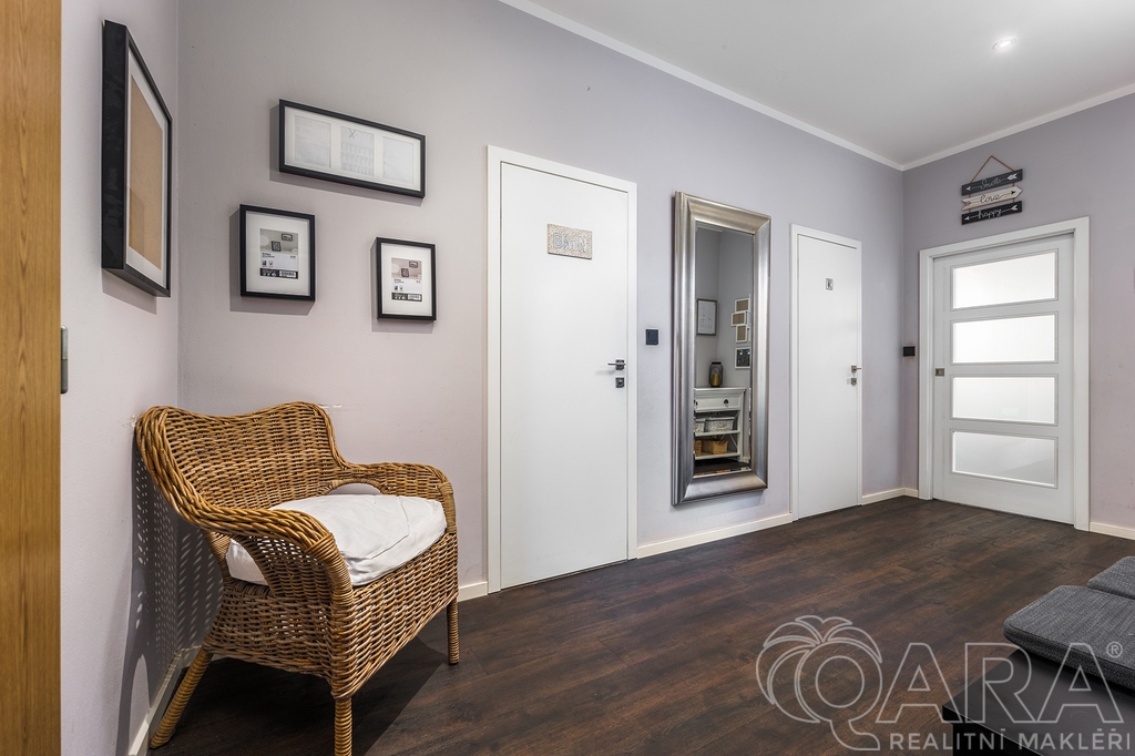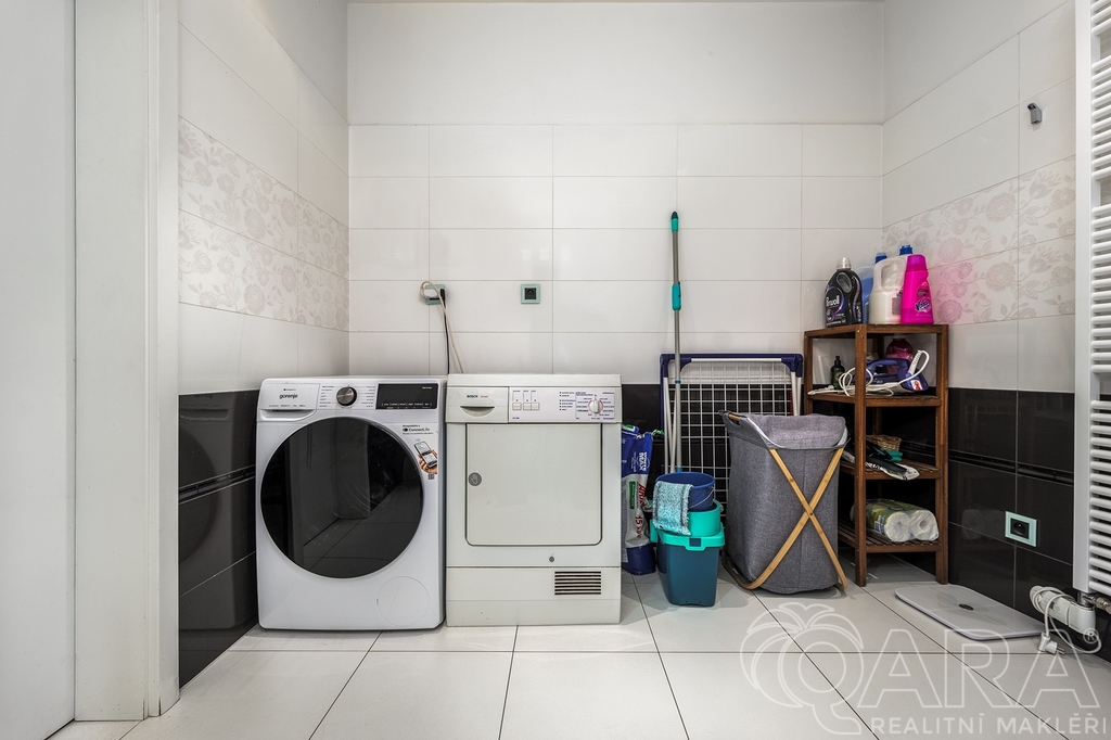 Najdete zde prostorný obývací pokoj se vstupem na předzahrádku, jehož součástí je kout s moderní kuchyňskou linkou se zabudovanými spotřebiči a velkou lednicí s mrazákem. K dispozici jsou také tři neprůchozí pokoje s veškerým vybavením, dvě koupelny s pračkou a sušičkou, dva záchody a komora. V první koupelně je vana a v druhé sprcha. Jeden záchod je v samostatné místnosti.