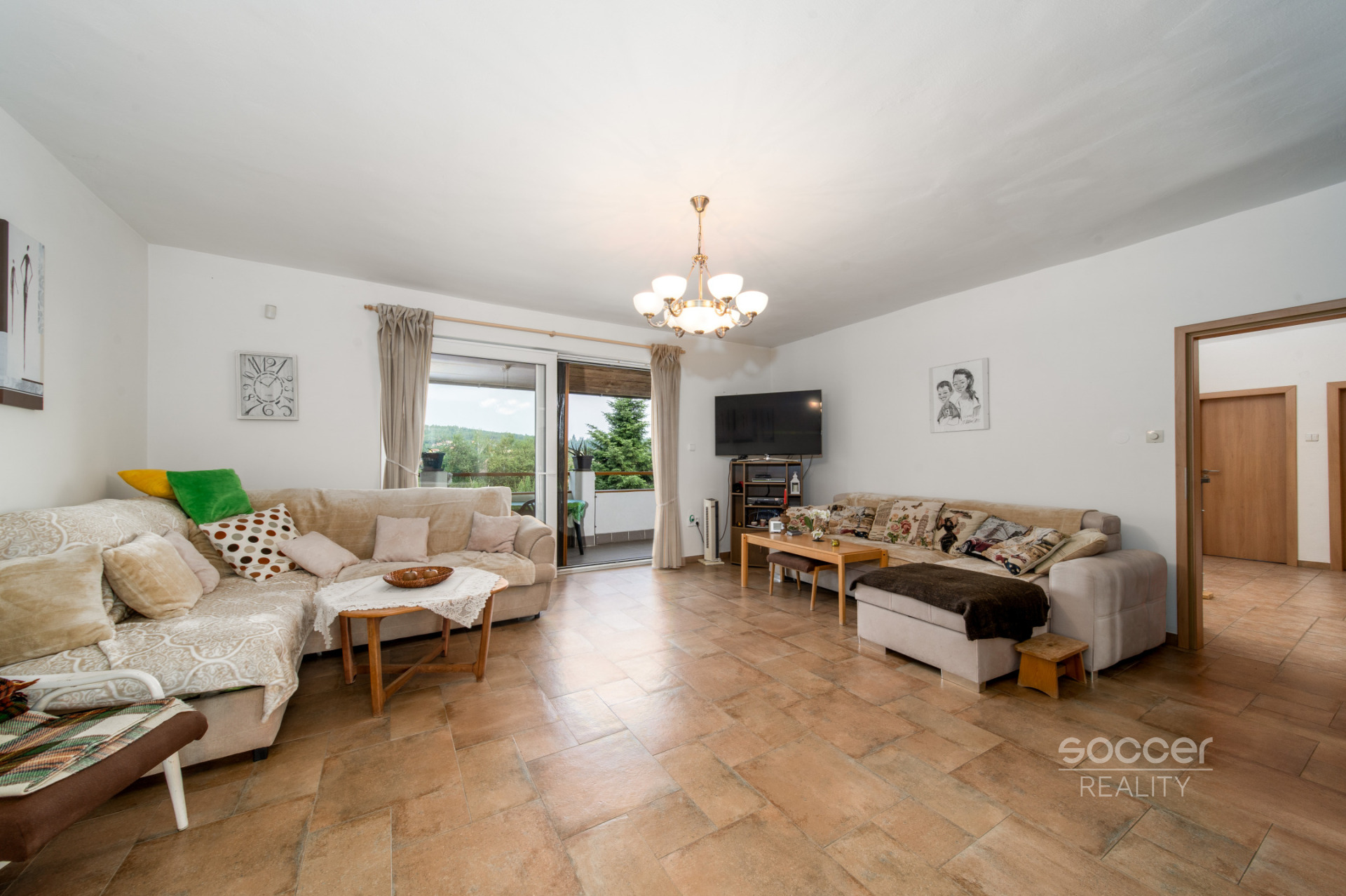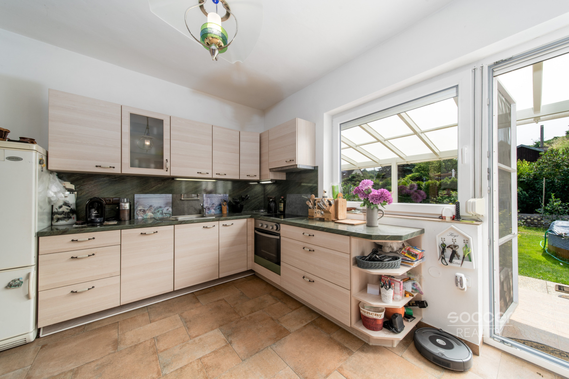 Dominantou domu je světlý obývací pokoj s krbovými kamny, která vytvářejí příjemnou atmosféru a zároveň efektivně vytápí prostor. Na obývací část navazuje jídelna a kuchyně s plně vybavenou kuchyňskou linkou. Z kuchyně je vstup na zahradu a terasu, ideální pro relaxaci nebo posezení s rodinou a přáteli. Dalším benefitem je krytá terasa s krásným výhledem do okolí.