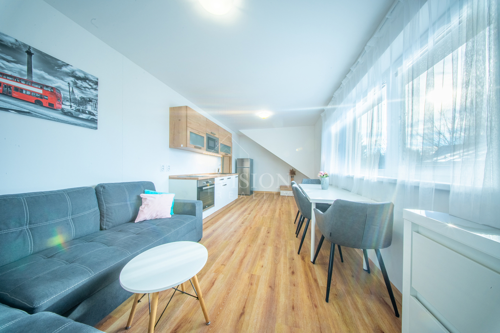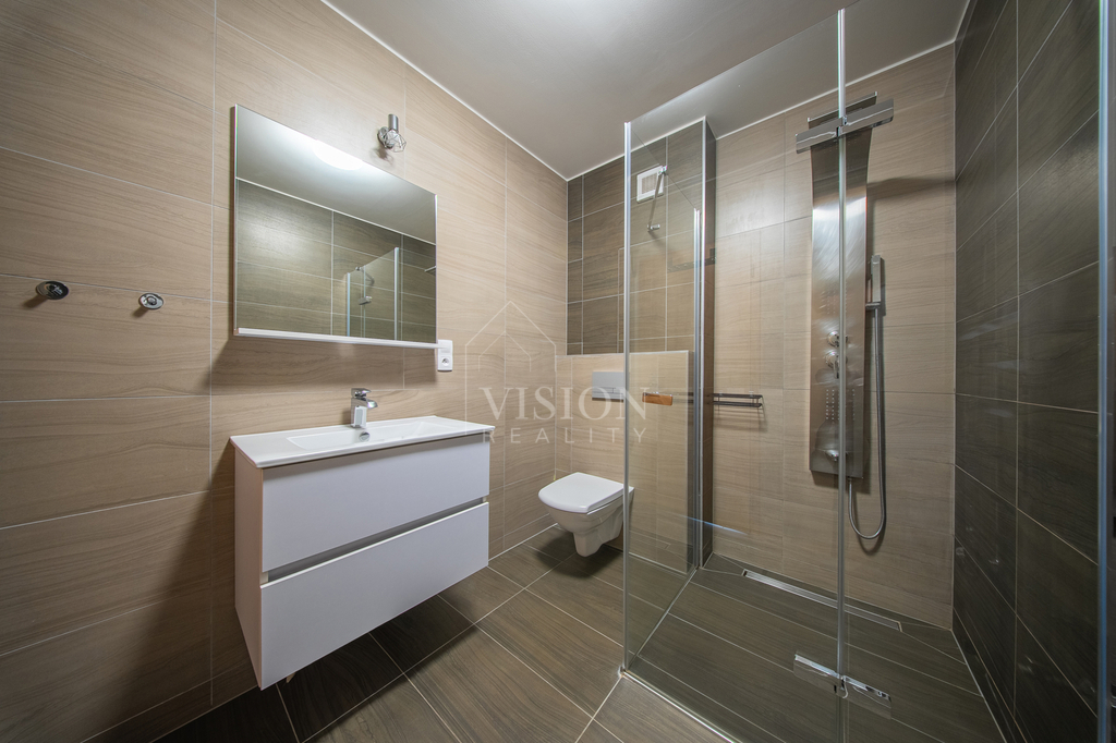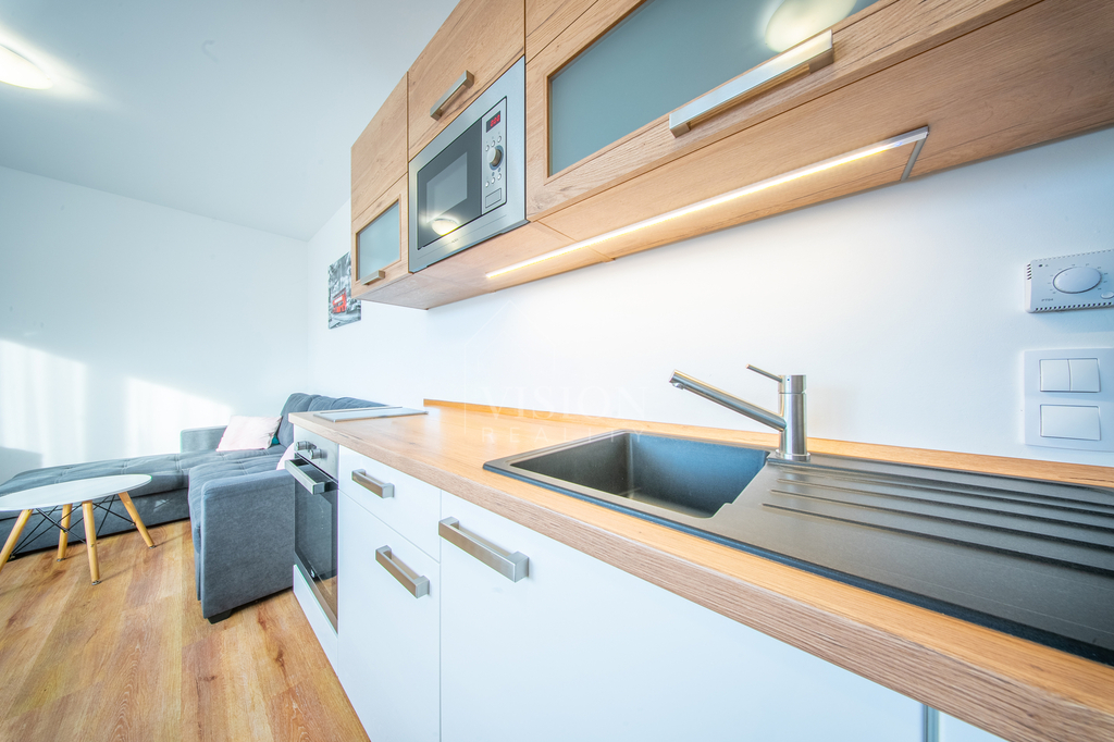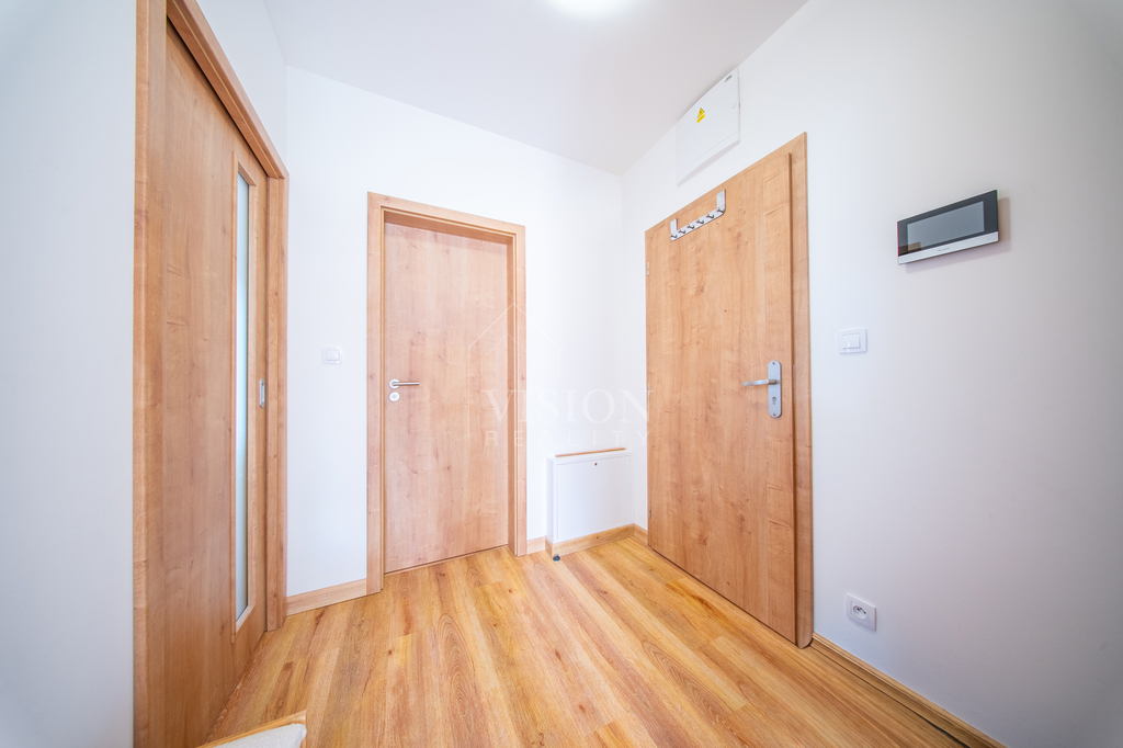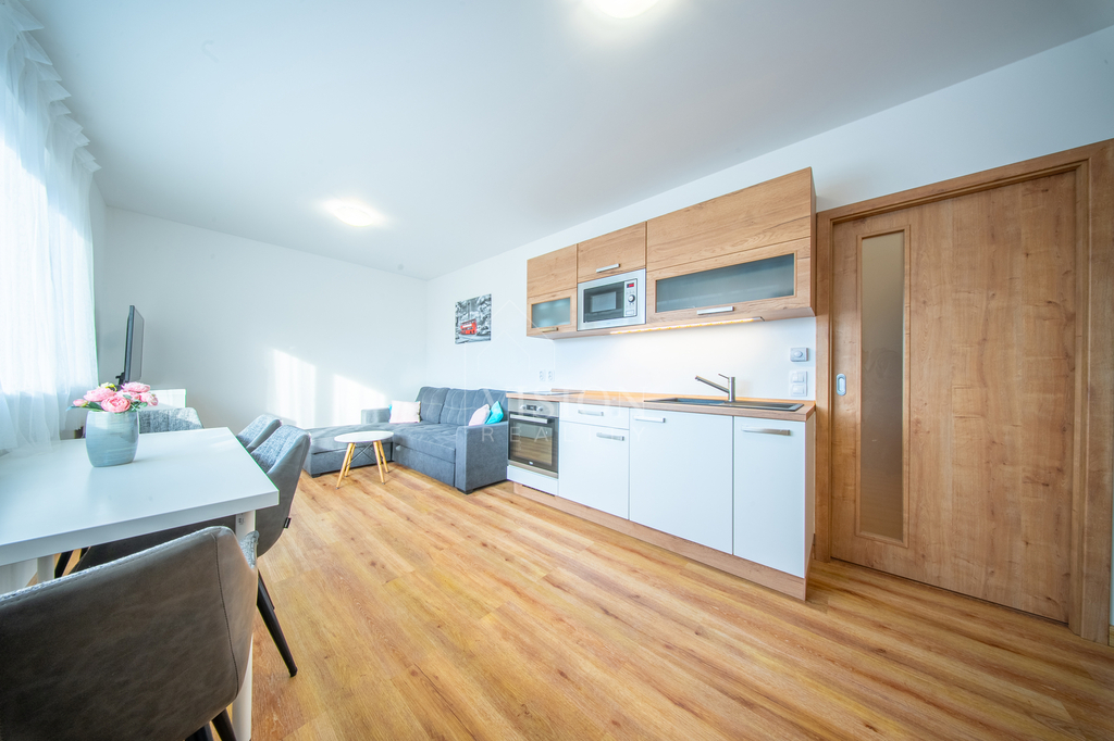 Byt je v osobním vlastnictví a prodává se kompletně vybavený, což umožňuje okamžité nastěhování nebo rychlé zahájení pronájmu bez nutnosti dalších investic. Dispozice je velmi praktická – obývací pokoj s kuchyňským koutem tvoří centrální část bytu a navazuje na dvě samostatné ložnice. Součástí je moderní koupelna s toaletou, vybavená kvalitní sanitou.