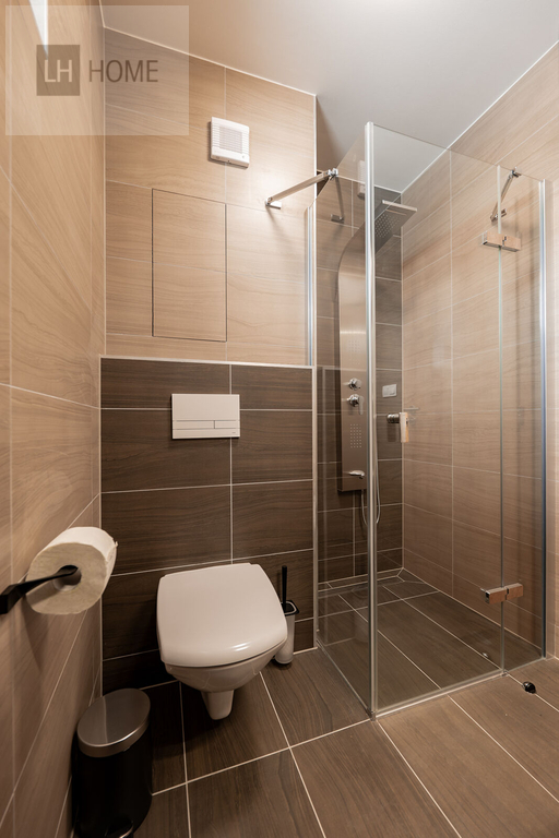 Koupelna se sprchovým koutem, umyvadlem, zrcadlem, závěsným WC a topným žebříkem