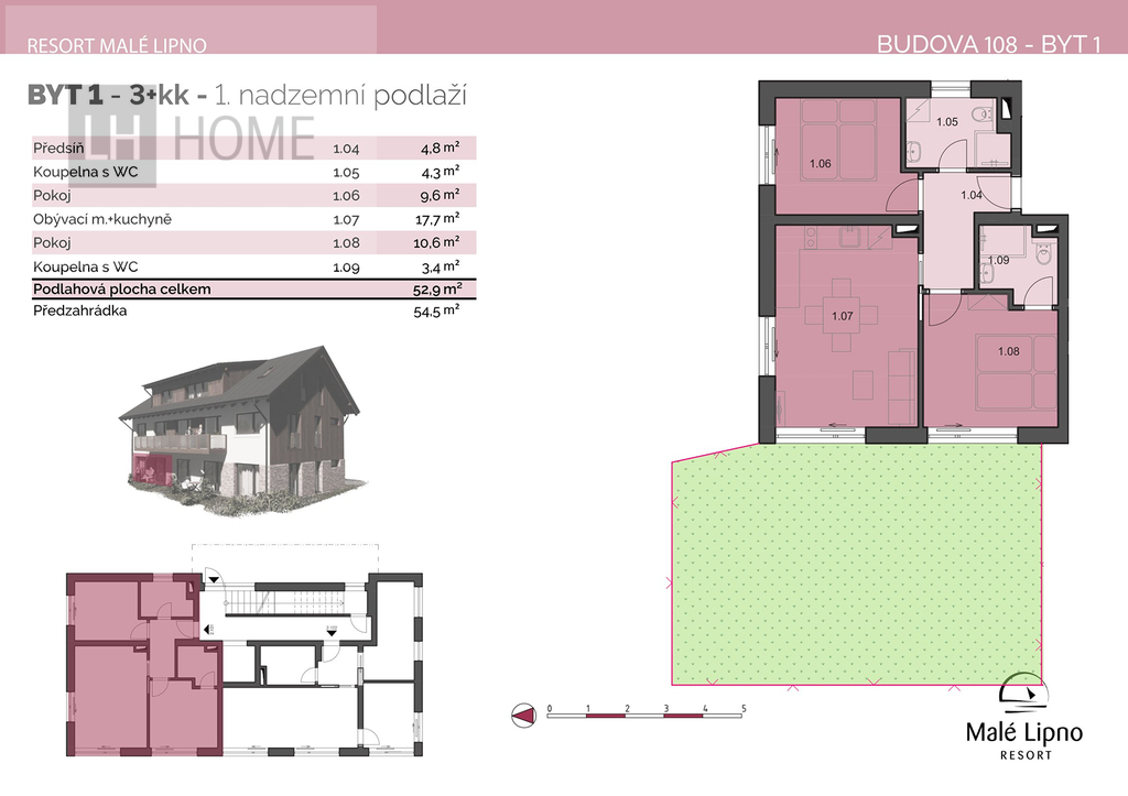 Hledáte klidné místo k životu nebo výhodnou investici u lipenské přehrady? Nabízíme moderní byt 3+kk o velikosti 52,89 m², situovaný v přízemí bezbariérového domu SO 108 v projektu Resort Malé Lipno. K bytu náleží předzahrádka o ploše 54,5 m², ideální pro rodinné posezení, relaxaci nebo letní grilování.