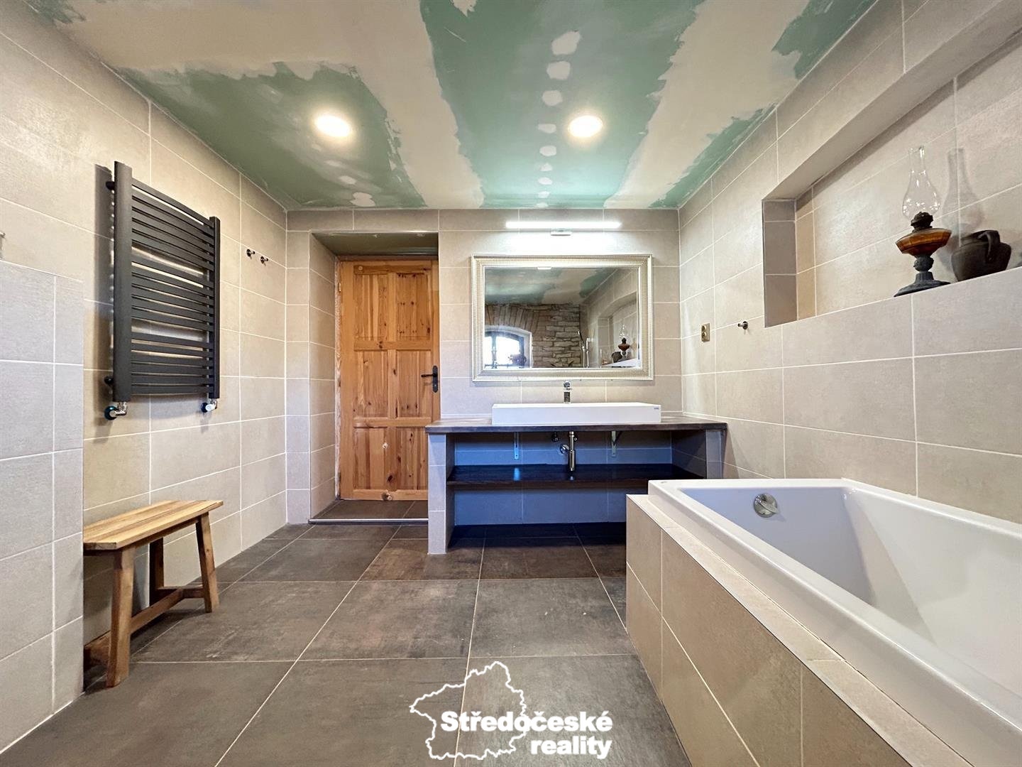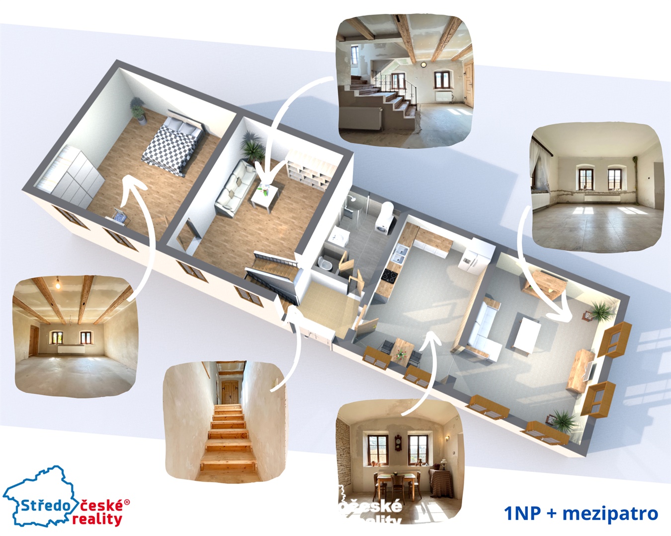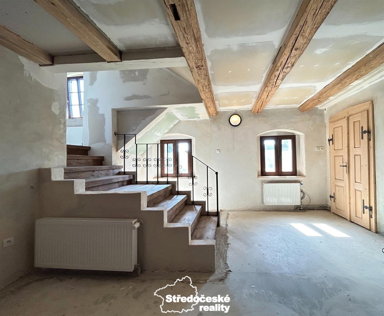 • nové omítky, zateplený strop s přiznanými trámy, sádrokarton, připravené podlahy