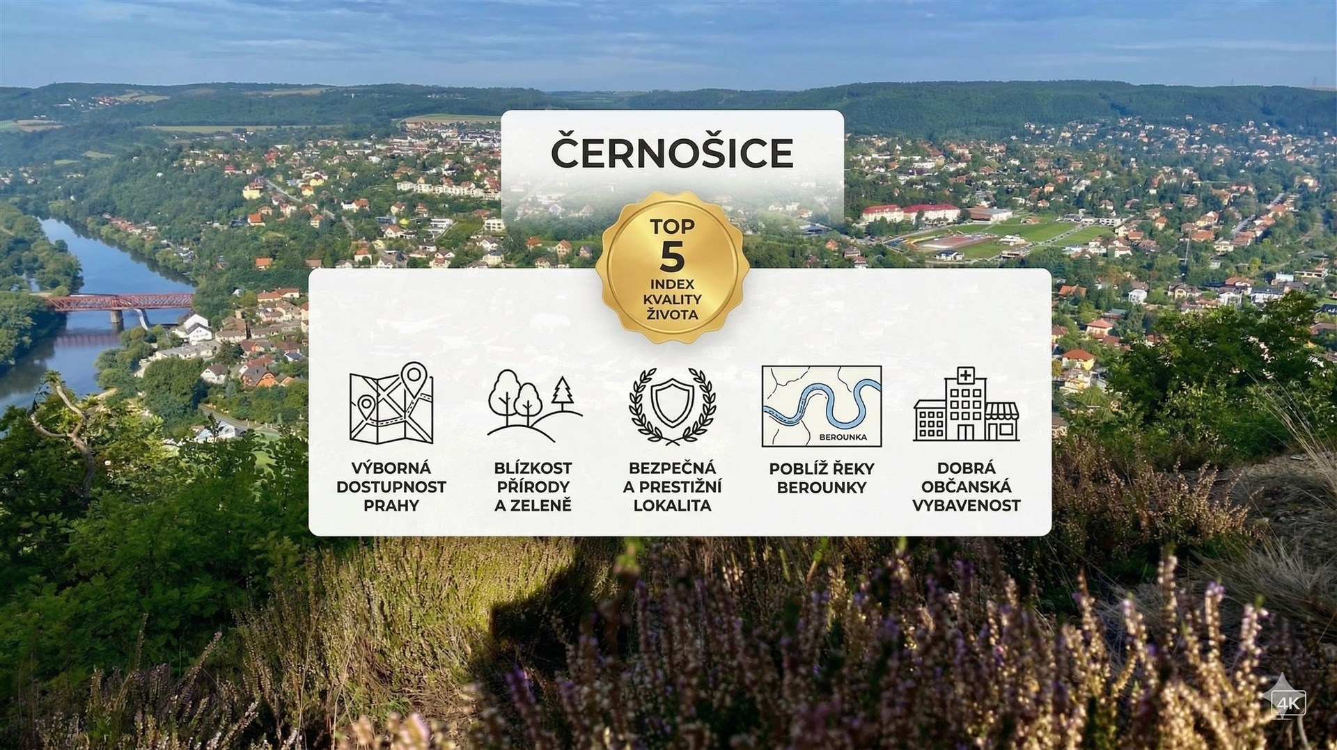 Index kvality života: Černošice nabízí prestižní komunitu, bezpečí a veškerou občanskou vybavenost. Vlakem jste na Smíchově za 15 minut, na Hl. nádraží pak do 30 minut.