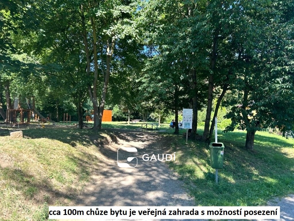 Lze navštěvovat veřejnou parkovou zahradu s posezením cca 100m chůze od bytu, která je umístěná za dobře zásobenou prodejnou Albert.