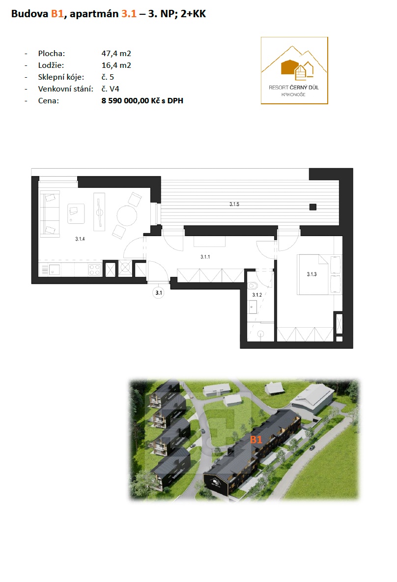 Tato konkrétní jednotka se nachází ve 3.nadzemním podlaží v části B1, s označením 3.1, má celkovou plochu 47,4m2 s lodžií o ploše 16,40m2, na kterou je vstup z obou místností i z předsíně. V ceně je sklepní kóje a jedno venkovní parkovací stání. Cena je uvedená bez DPH (21%).